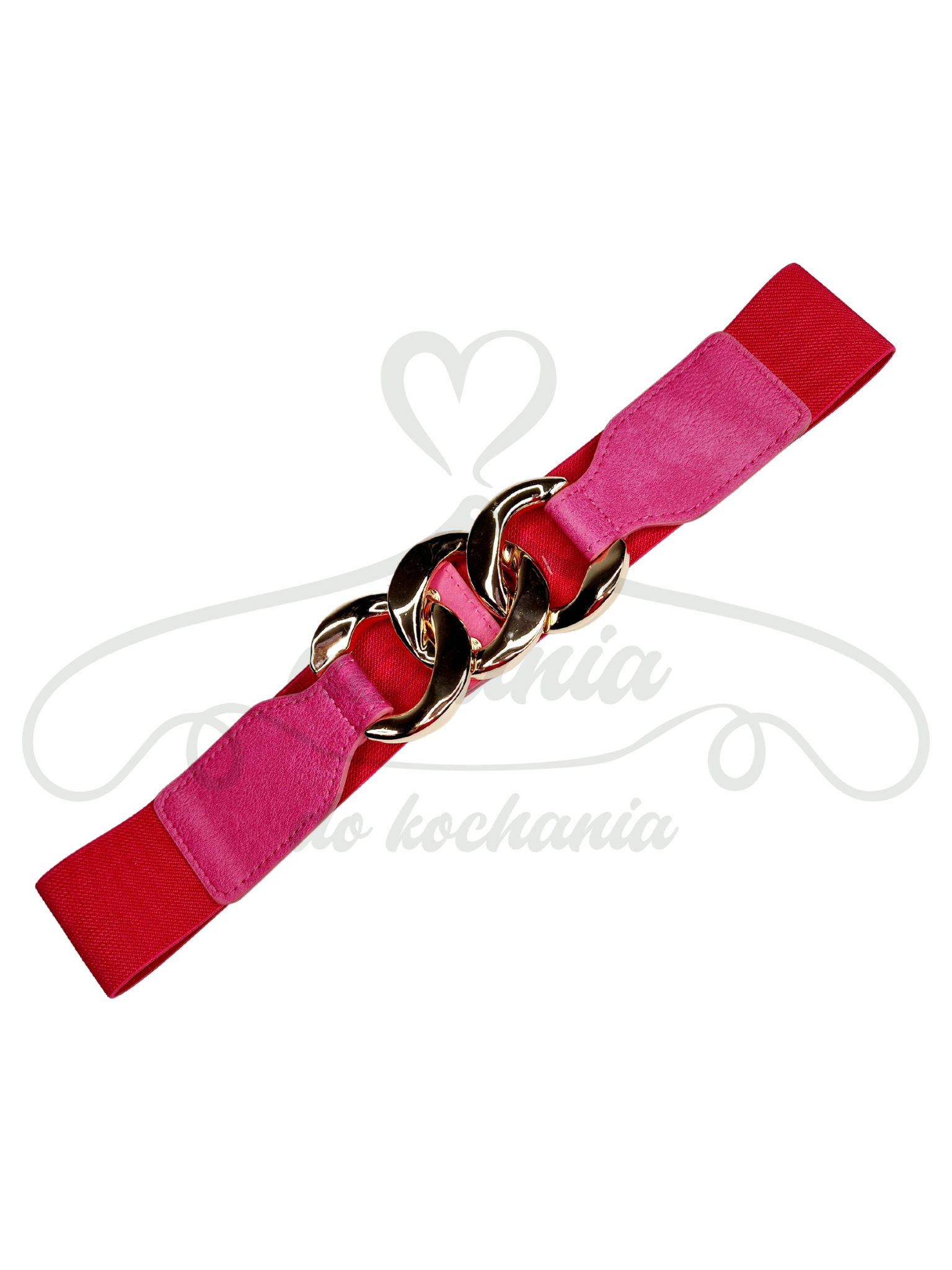 Różowy damski pasek na gumie. Przód wykończony skórą ekologiczną na której znajduje się złoty łańcuch. Pasek stworzony z bardzo elastycznego i rozciągliwego tworzywa idealnie dopasowujący się do każdego typu sylwetki. Zapinany jest z tyłu na dwa zatrzaski. Idealnie dopełni każda stylizację. Będzie pasował do kamizelki, kardiganu czy nawet do sukienki oraz koszuli.