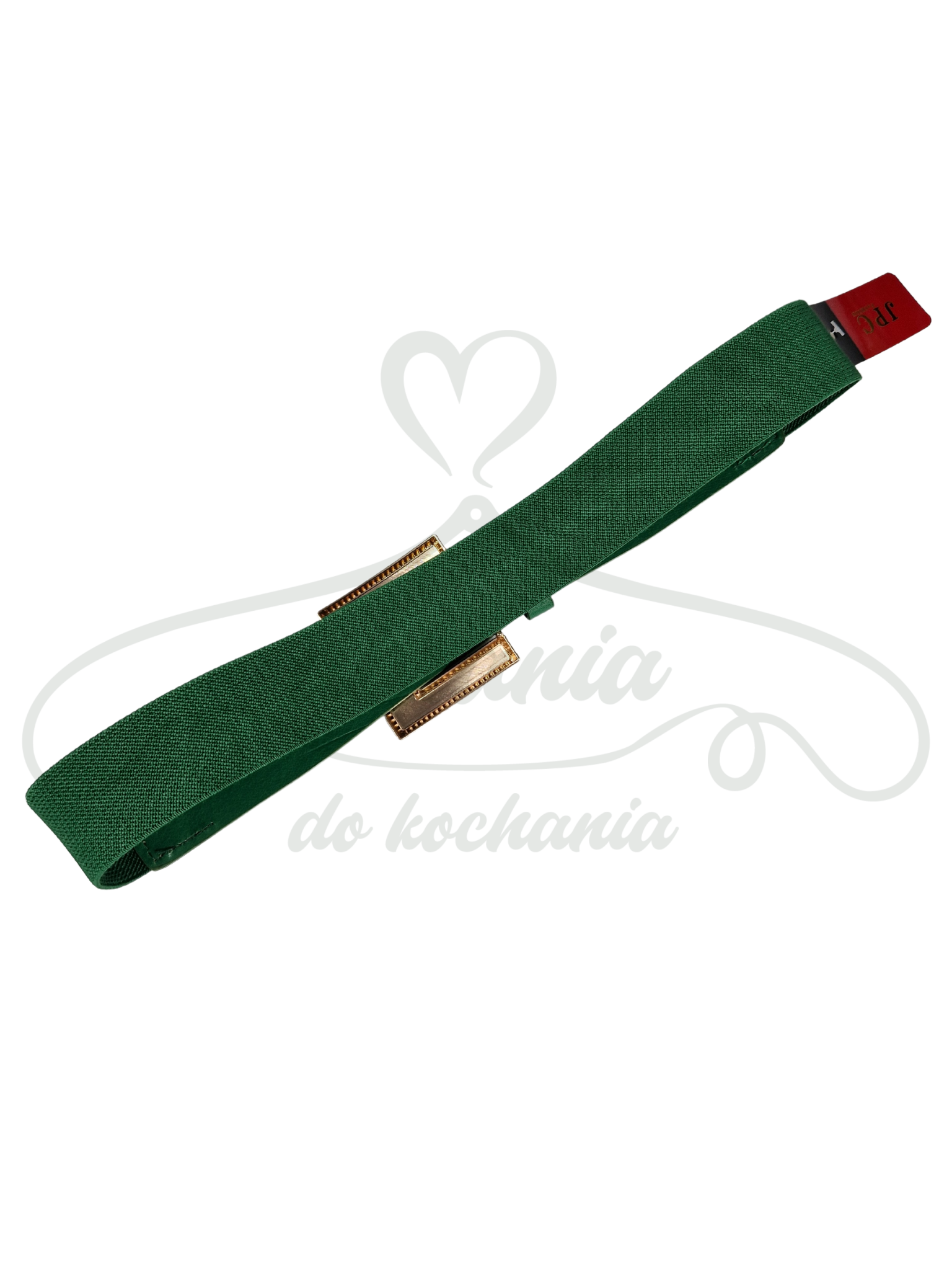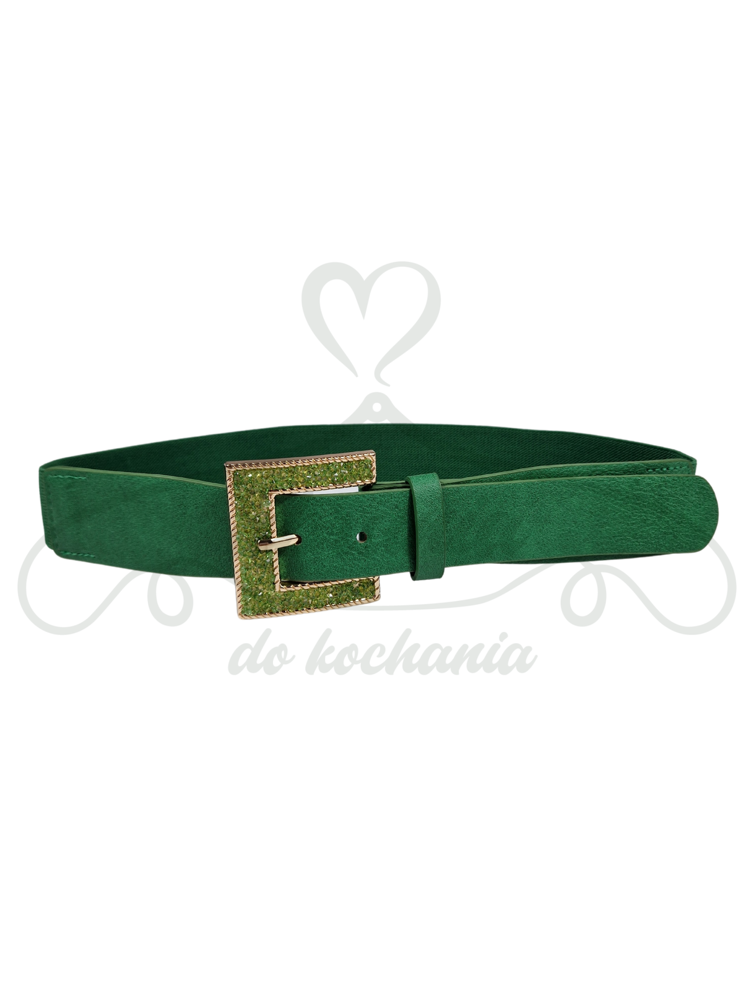 Damski pasek na gumie w kolorze zielonym z klamerką w kolorze złotym wysadzaną cyrkoniami w takim samym kolorze jak pasek. Stworzony z bardzo elastycznego i rozciągliwego tworzywa, idealnie dopasowujący się do każdego typu sylwetki. Zapinany jest jak tradycyjny pasek, posiada dziurki do regulacji. Pasek mieści się w szlufkach od spodni. Z przodu posiada wstawki z eko skóry. Idealnie dopełni każda stylizację i będzie pasował do kamizelki, kardiganu czy nawet do sukienki oraz koszuli.