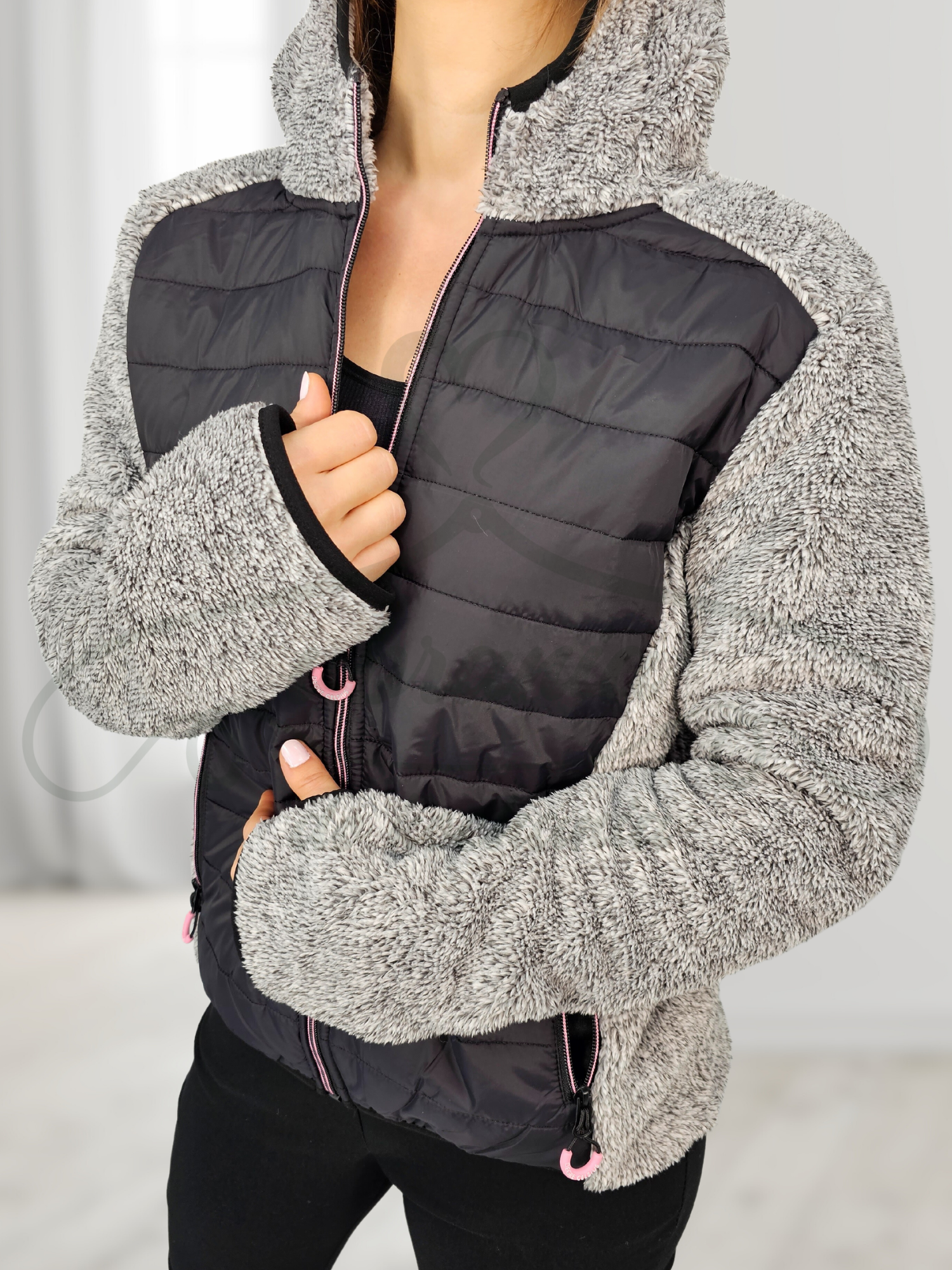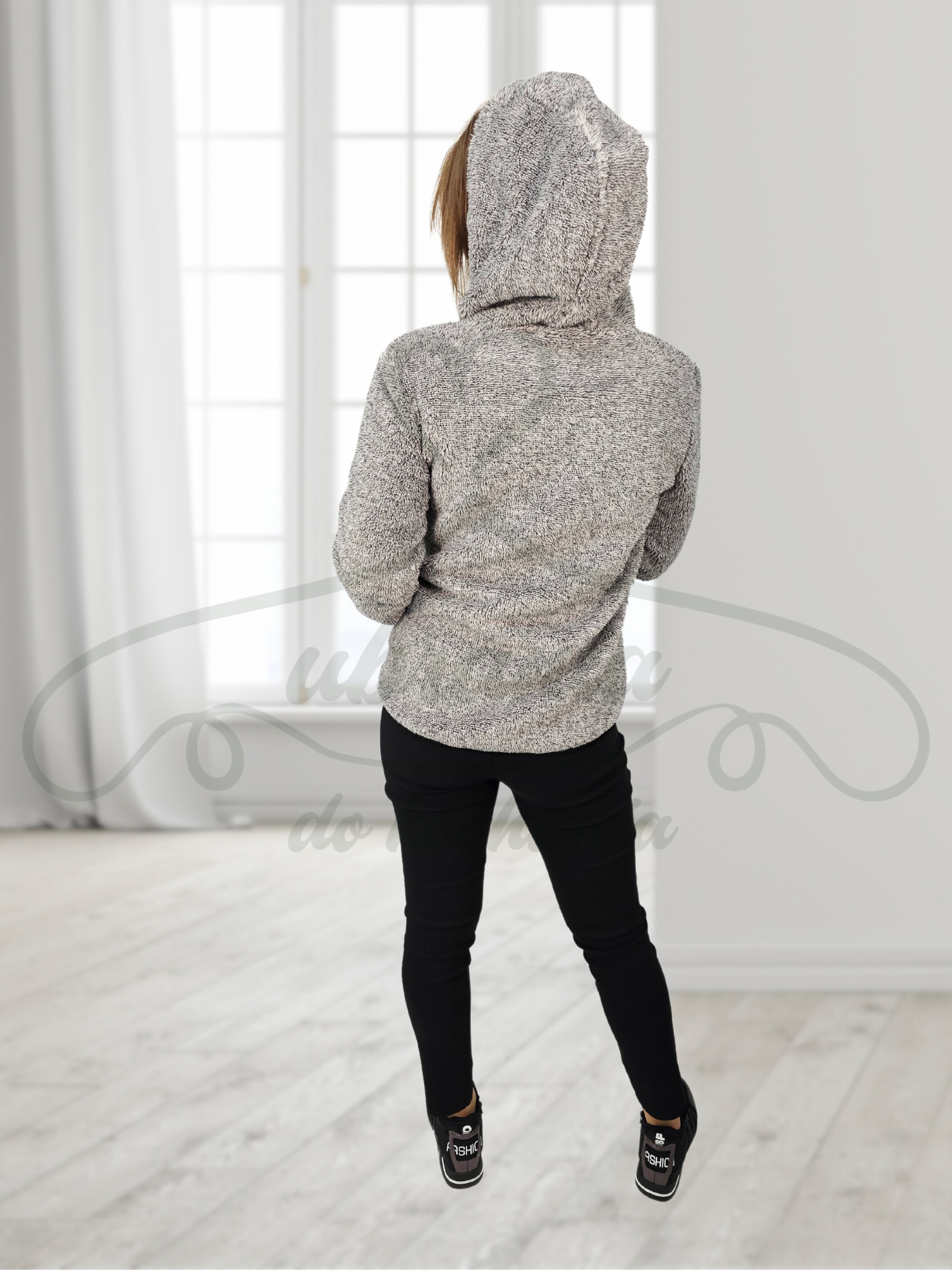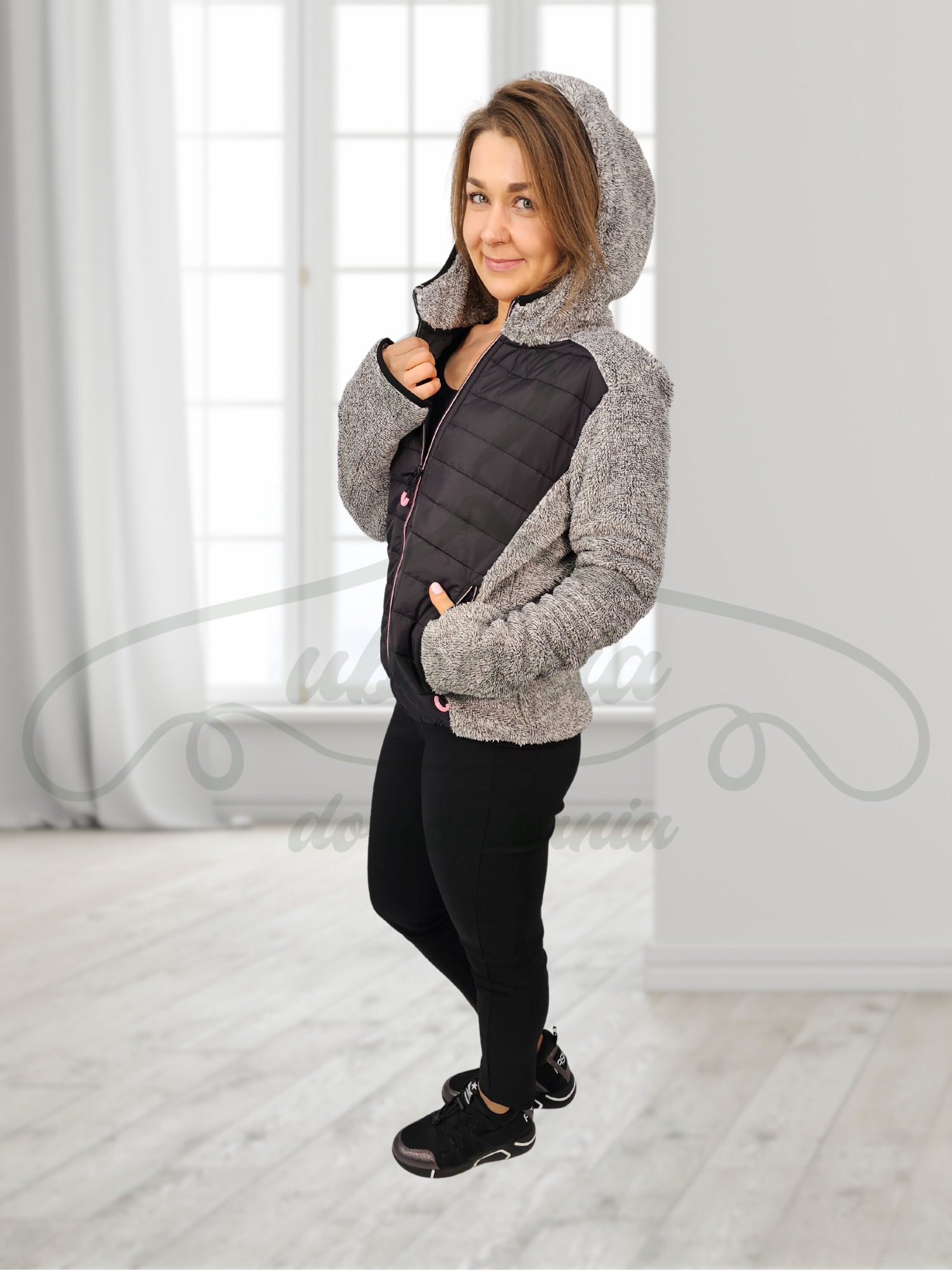 Bluza z futerkiem w kolorze szarym zapinana na zamek. Posiada kaptur oraz dwie kieszenie po bokach zapinane na zamek. Idealnie sprawdza się jako okrycie wierzchnie w chłodniejsze dni wiosna oraz zima pod kurtkę. Na przodzie posiada jeszcze pikowany materiał co dodaje jej uroku i może być traktowana jako kurtka. Na końcu rękawa posiada wcięcie które umożliwia nam włożenie kciuka. Wykonana z miękkiego i wysokogatunkowego materiału przyjemnego w dotyku.