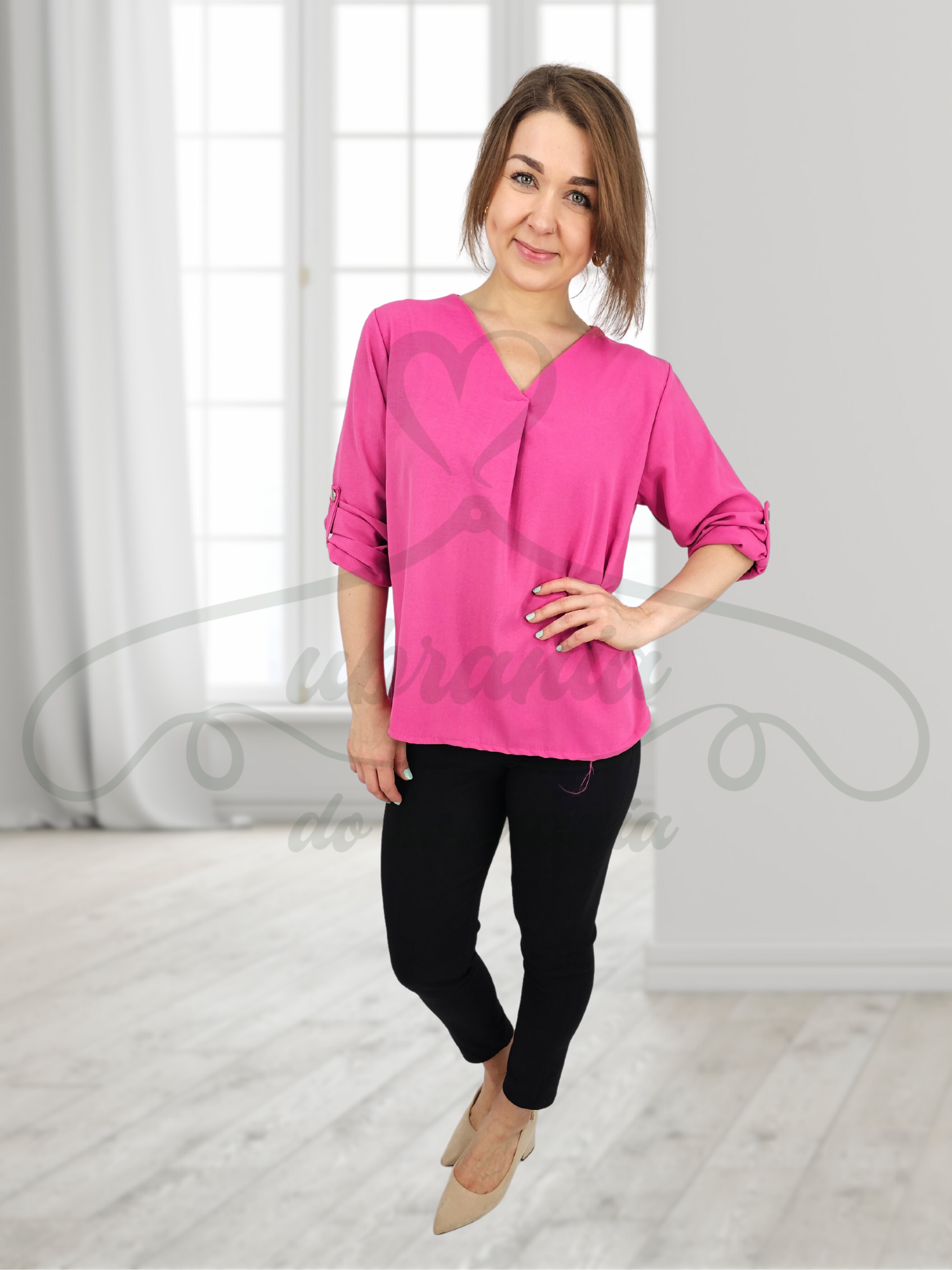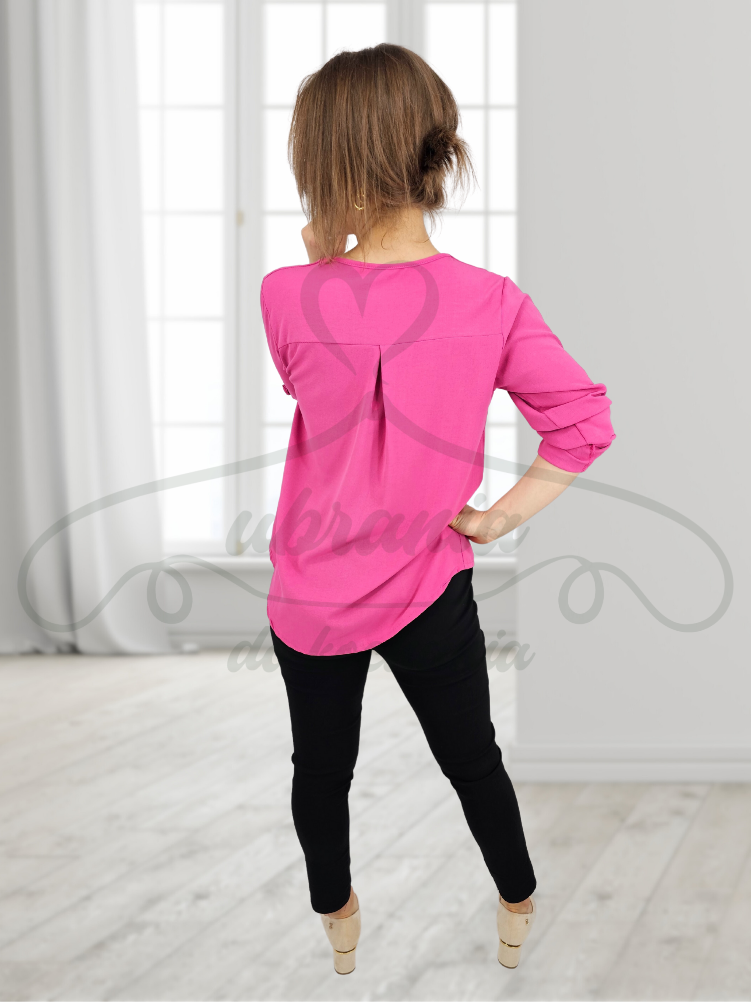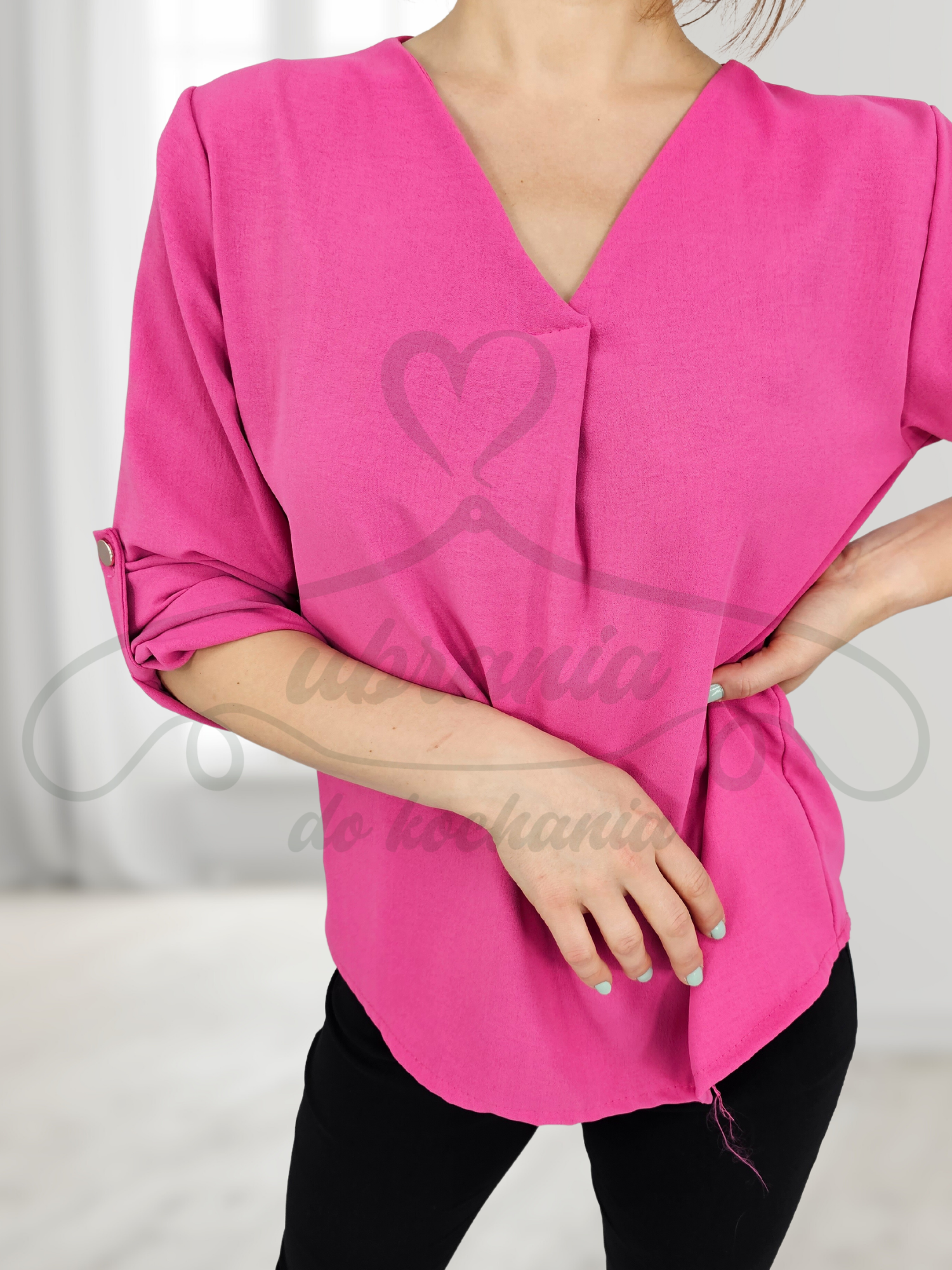 Nowoczesna bluzka koszulowa o luźnym kroju w kolorze różowym. Model z dekoltem w serek oraz na zakładkę. Rękaw długi z możliwością podpięcia na guzik. Rozmiar uniwersalny pasujący do każdej sylwetki. Wykorzystasz ją w wielu codziennych i eleganckich stylizacjach!