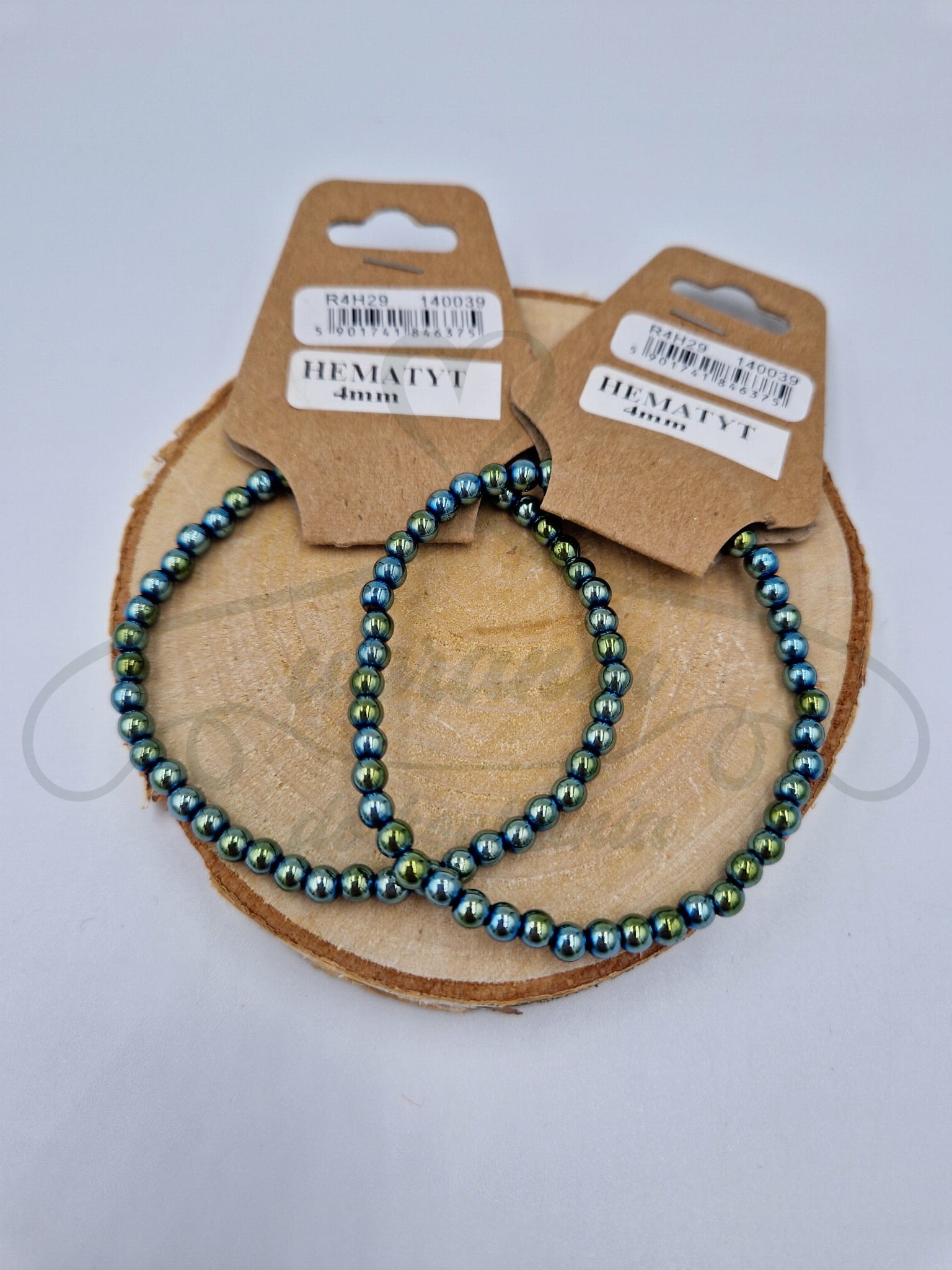 Efektowna bransoletka z opalizujących kamieni hematytu o średnicy 4 mm w odcieniach zieleni i błękitu. Elastyczna gumka zapewnia wygodne noszenie na co dzień. Pięknie mieni się w świetle, przyciągając spojrzenia i dodając oryginalnego charakteru każdej stylizacji. Idealna solo lub w zestawie z innymi bransoletkami.