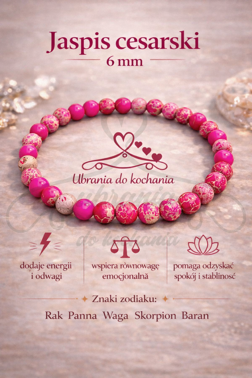Energetyczna bransoletka wykonana z kulistych kamieni jaspisu cesarskiego w odcieniach różu i fuksji. Każdy koralik ma unikalny rysunek żyłkowania, co sprawia, że każda bransoletka jest jedyna w swoim rodzaju. Kamienie mają średnicę 6 mm i zostały osadzone na elastycznej gumce, zapewniając wygodne dopasowanie do nadgarstka.