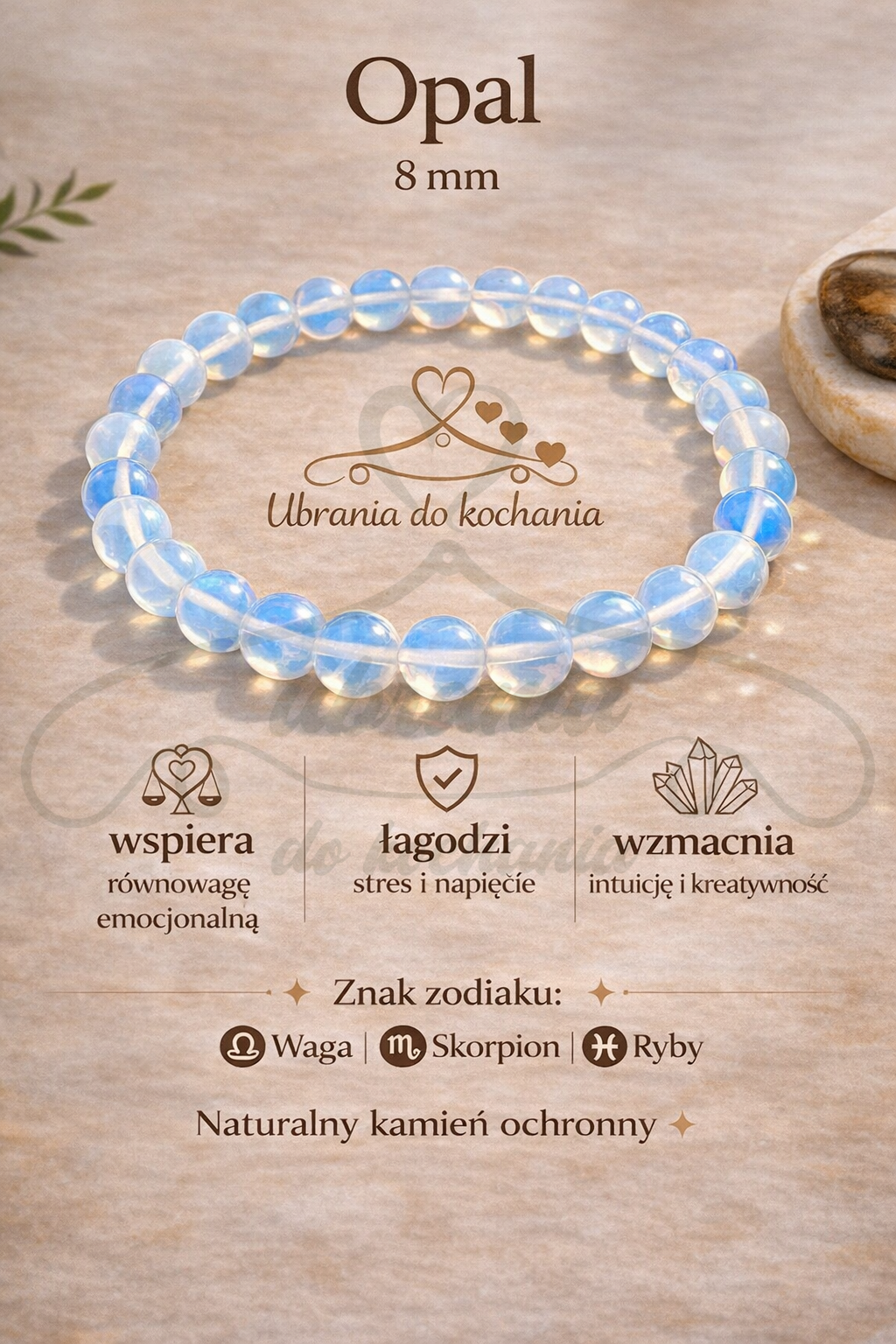 Opal jako kamień szlachetny wzmacnia zdolności komunikacyjne człowieka i jego dobre samopoczucie poprzez różnorodne działanie. Wspomaga żołądek i jelita oraz wzmacnia serce. Na dodatek jego energia wpływa na przyswajanie żelaza i stymuluje działanie nerek.