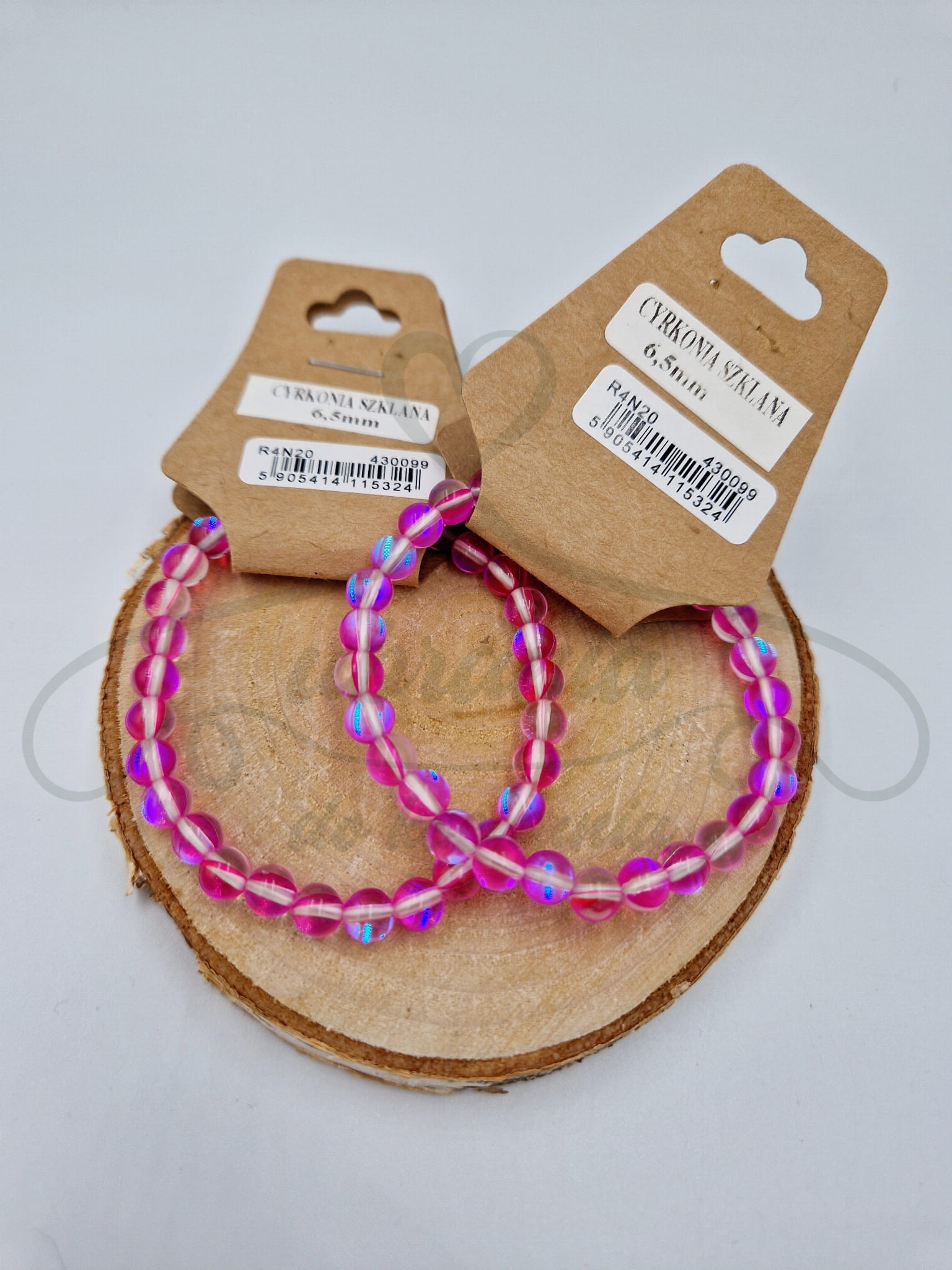 Delikatna i błyszcząca bransoletka z transparentno-różowych koralików z efektem opalizacji. Wykonana ze szklanej cyrkonii o średnicy 6,5 mm, pięknie odbija światło, tworząc subtelny, tęczowy połysk. Osadzona na elastycznej gumce – wygodna, lekka i pełna dziewczęcego uroku. Idealna do codziennych stylizacji lub jako uroczy dodatek na prezent.