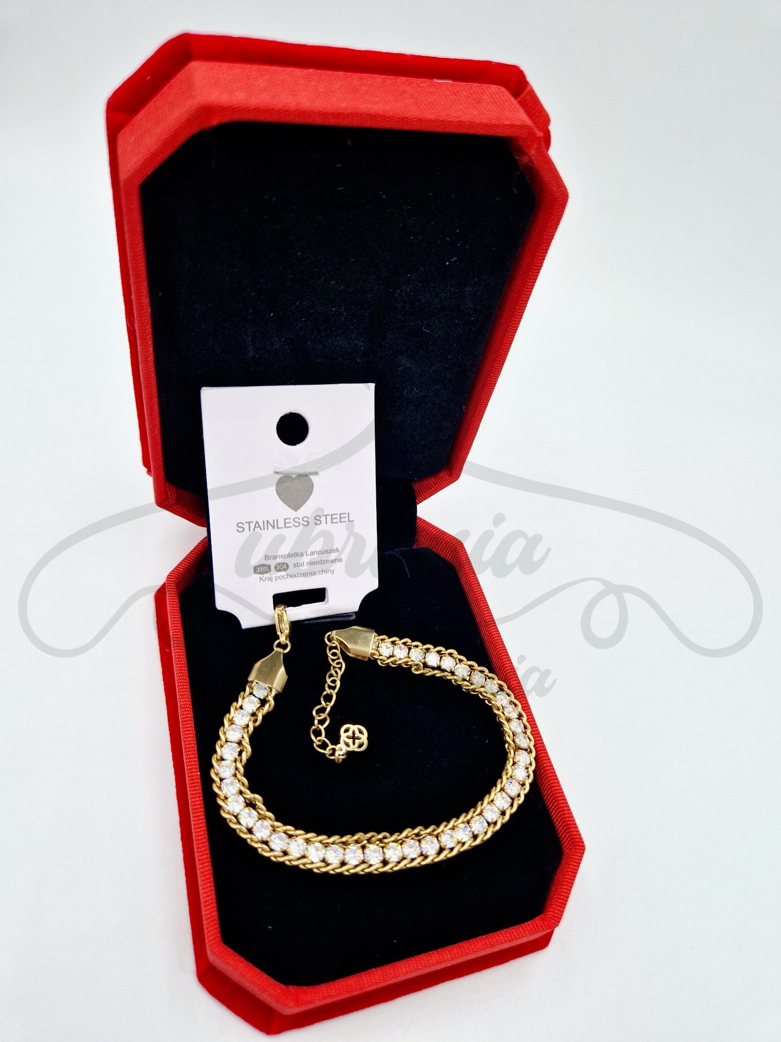 Ta piękna bransoletka w kolorze złotym została ozdobiona wieloma, mieniącymi się w świetle cyrkoniami. Pasuje do każdego typu ubioru i podkreśli niezwykły styl i szyk właścicielki. Bransoletka ta będzie również idealnym prezentem dla wyjątkowej osoby.