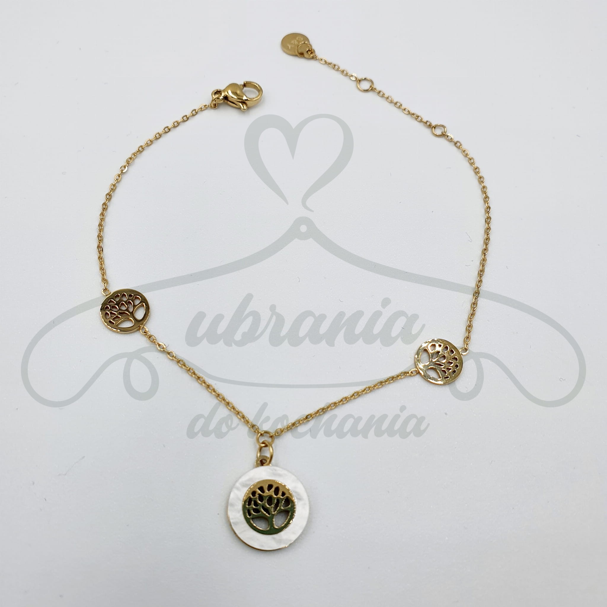 Bransoletka drzewko szczęścia z białą masą perłową w kolorze złotym wykonana z wysokiej jakości stali chirurgicznej 316L.