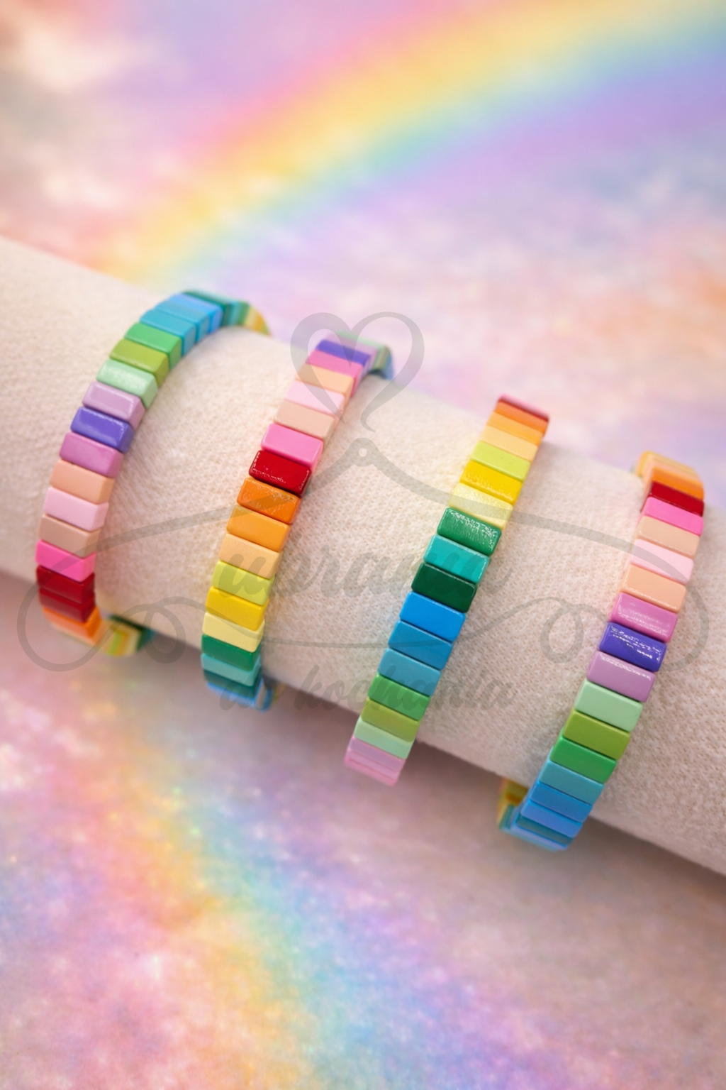 Wprowadź do swojej stylizacji odrobinę koloru! Te elastyczne bransoletki z tęczowych, emaliowanych kostek to idealny wybór na lato, festiwal lub po prostu dzień, kiedy potrzebujesz pozytywnej energii. Mix barw, lekkość i wygoda w jednym – noś je pojedynczo lub w zestawie!