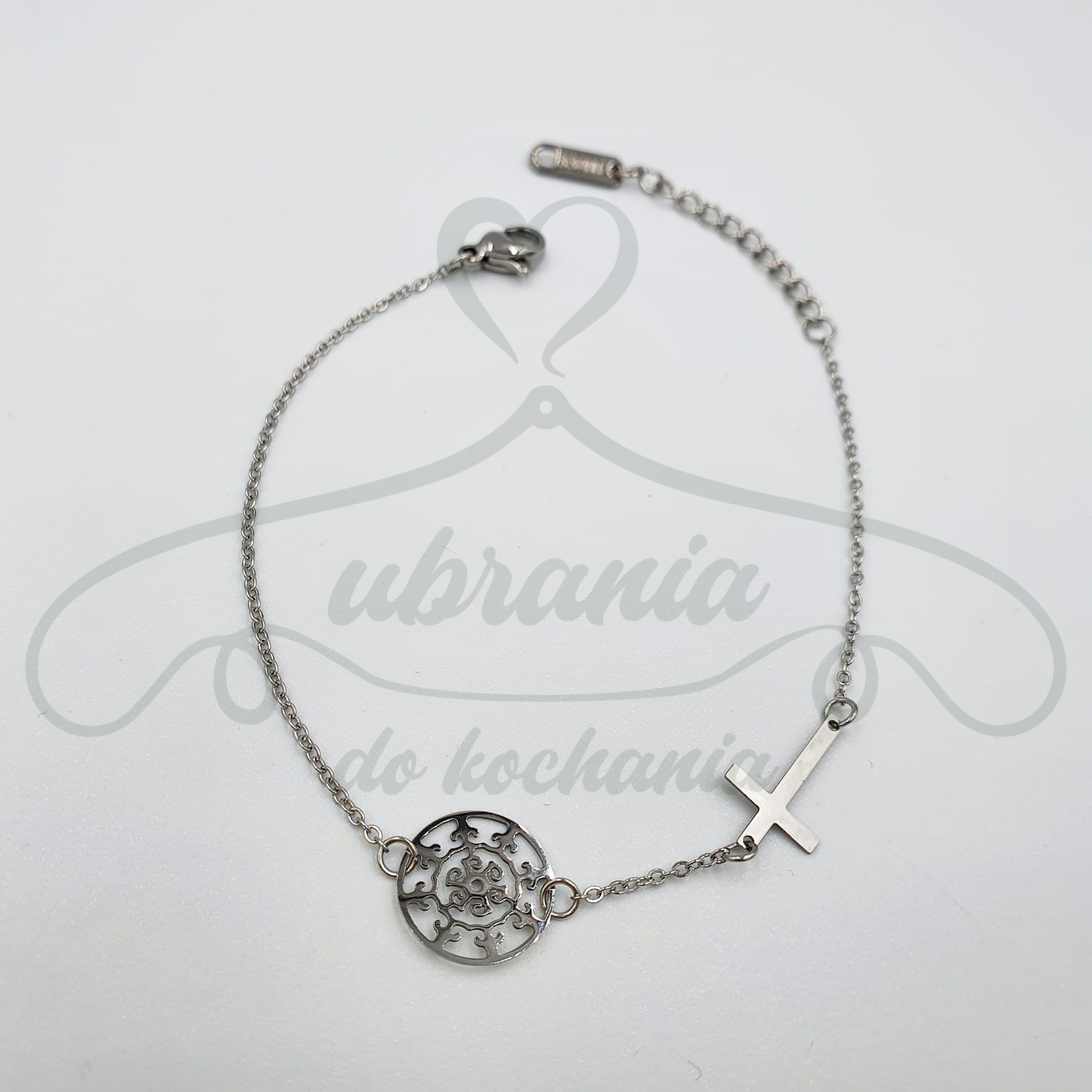Bransoletka krzyż poprzeczny w kolorze srebrnym oraz kółkiem w greckim stylu, wykonana z wysokiej jakości stali chirurgicznej 316L.