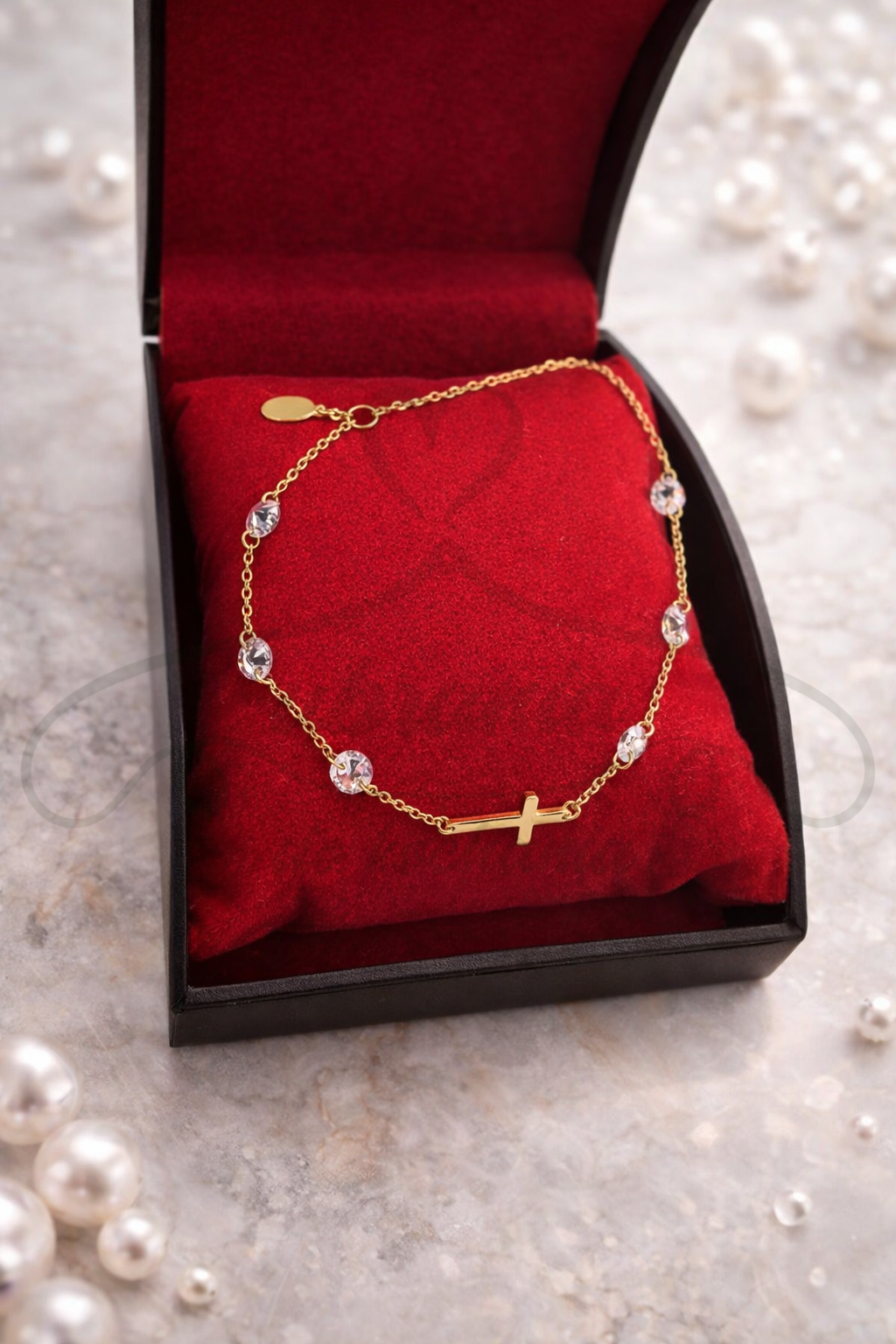 Bransoletka damska w kolorze złotym z krzyżykiem oraz cyrkoniami. Wykonana w całości ze stali szlachetnej 316 L. Świetnie prezentuje się w duecie z innymi bransoletkami lub zegarkiem. Raz założona będzie towarzyszyć Ci zawsze, idealnie wpasowując się w każdą Twoją stylizację.