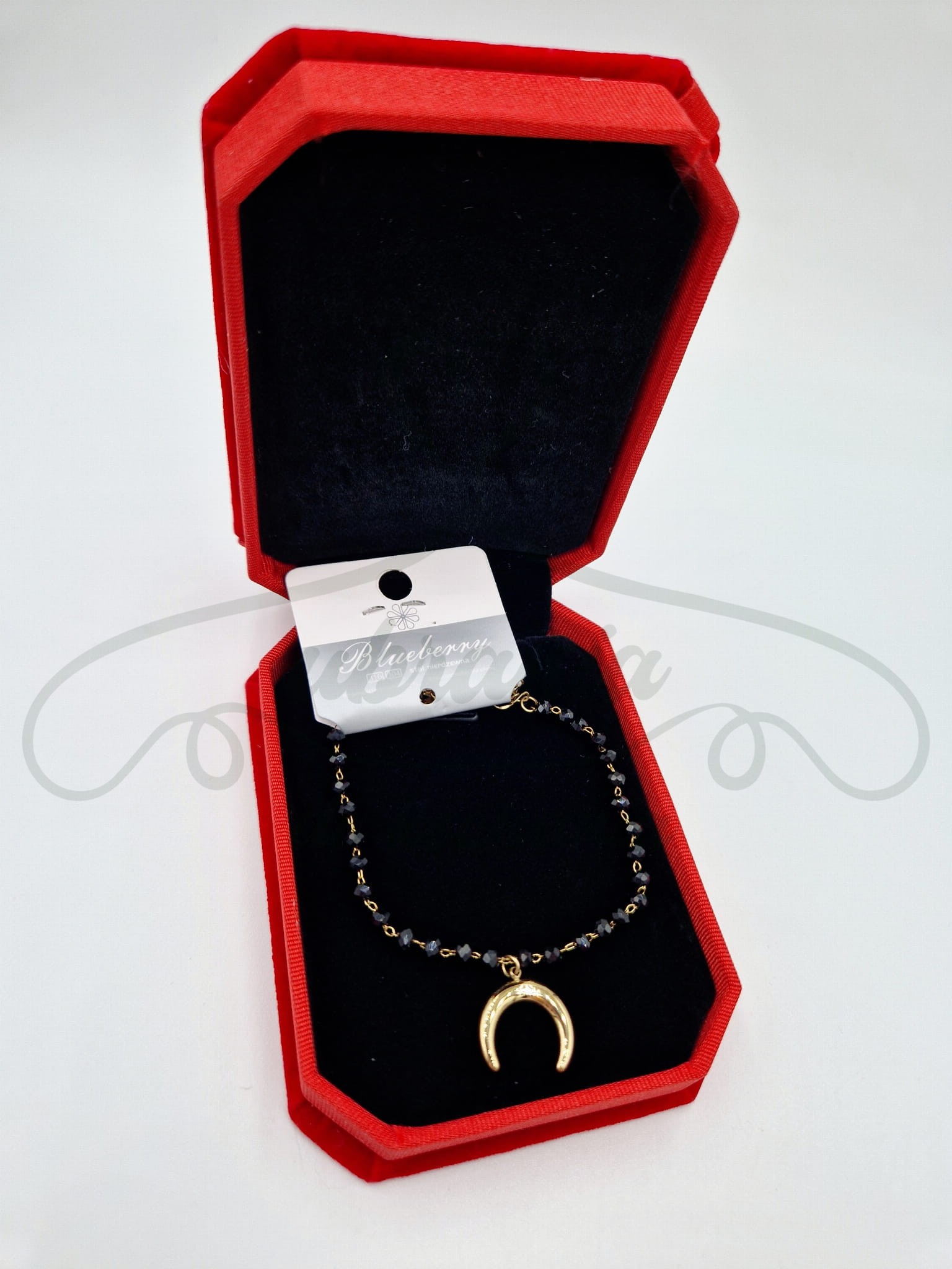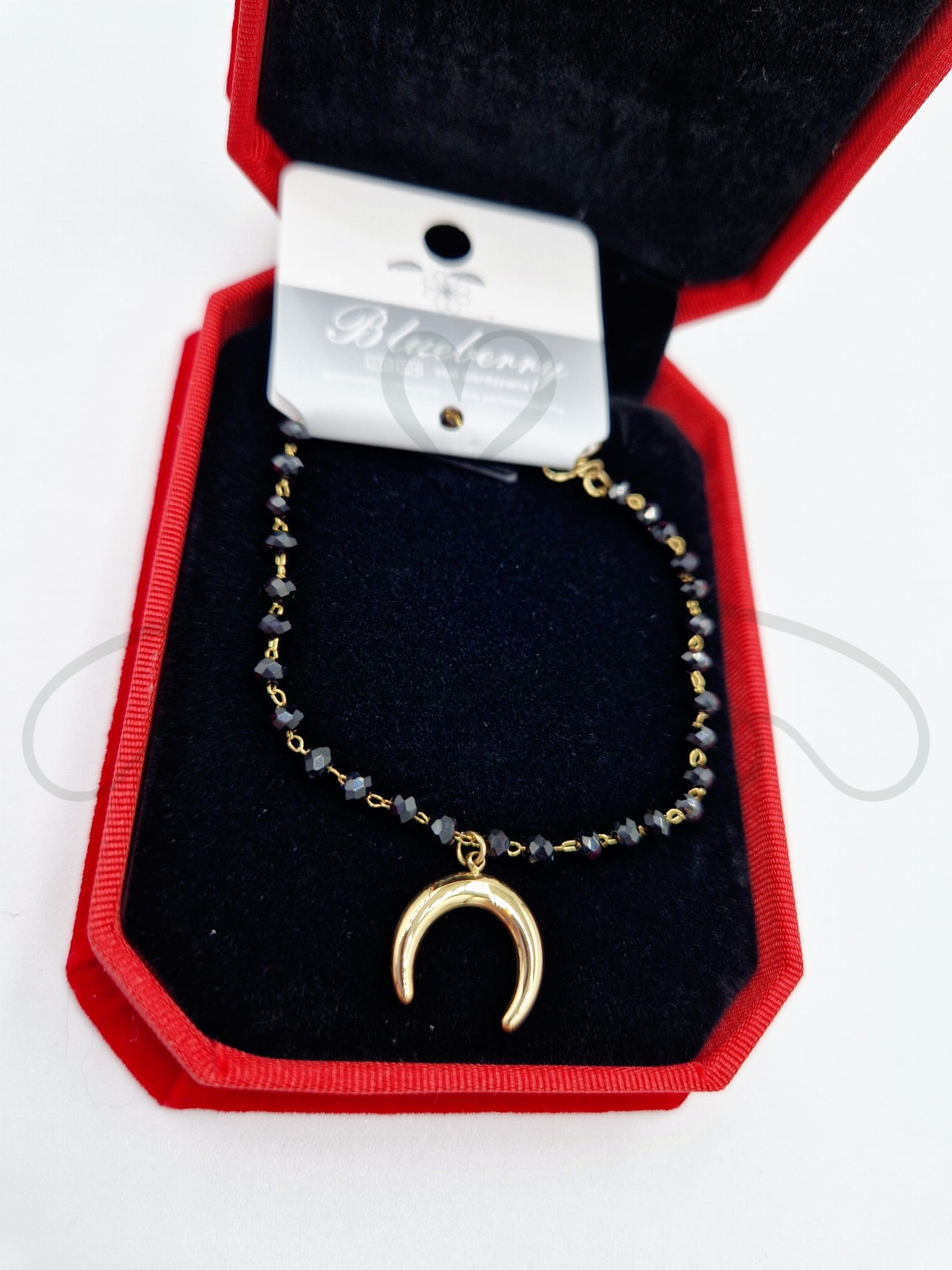 Oryginalna bransoletka z pięknymi, czarnymi koralikami i księżycem w kolorze złota, to idealny dodatek dla tajemniczych i eleganckich pań, które lubią podkreślać swój niezwykły styl. Bransoletka ta przywołuje na myśl piękny księżyc, oraz nawiązuje do stylu gotyku. Sprawdzi się zarówno na uroczystych przyjęciach jak i na co dzień.
