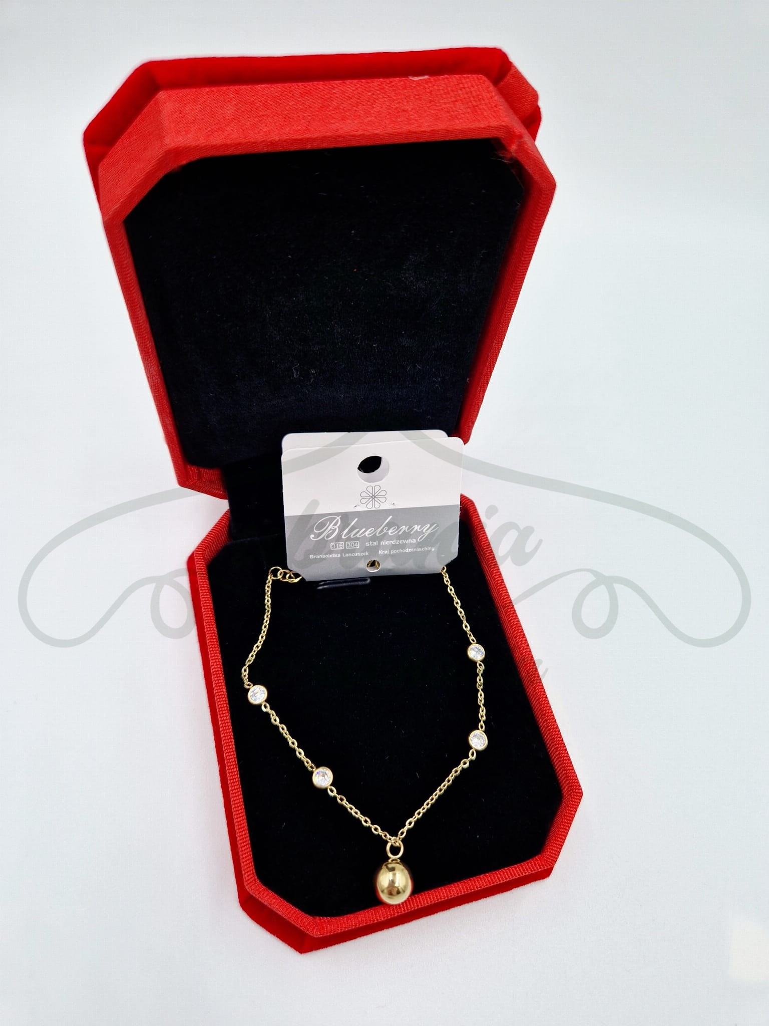 Bransoletka w kolorze złotym z kulką oraz małymi cyrkoniami. Model wykonany ze stali szlachetnej. Bransoletka delikatna widoczna na nadgarstku.