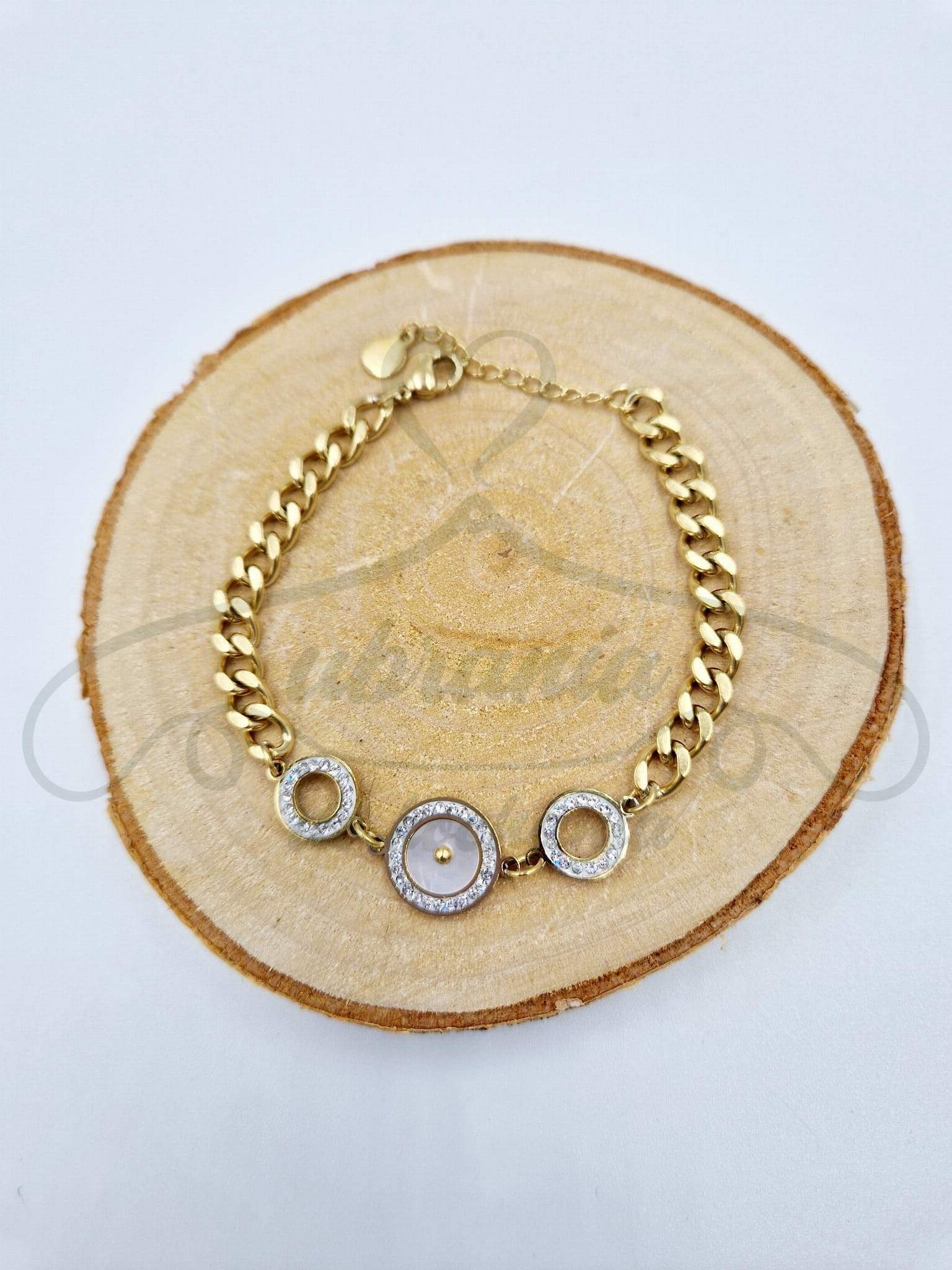 Bransoletka grubsza, masywniejsza z elementami cyrkonii i masy perłowej. Grubszy splot sprawia, iż będzie widoczniejsza na nadgarstku. Dodatkowo uroku dodają delikatne cyrkonie i całość wykonana ze stali szlachetnej najwyższej jakości!
