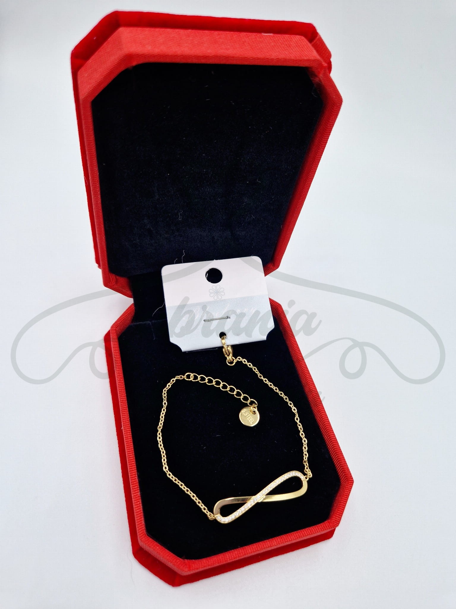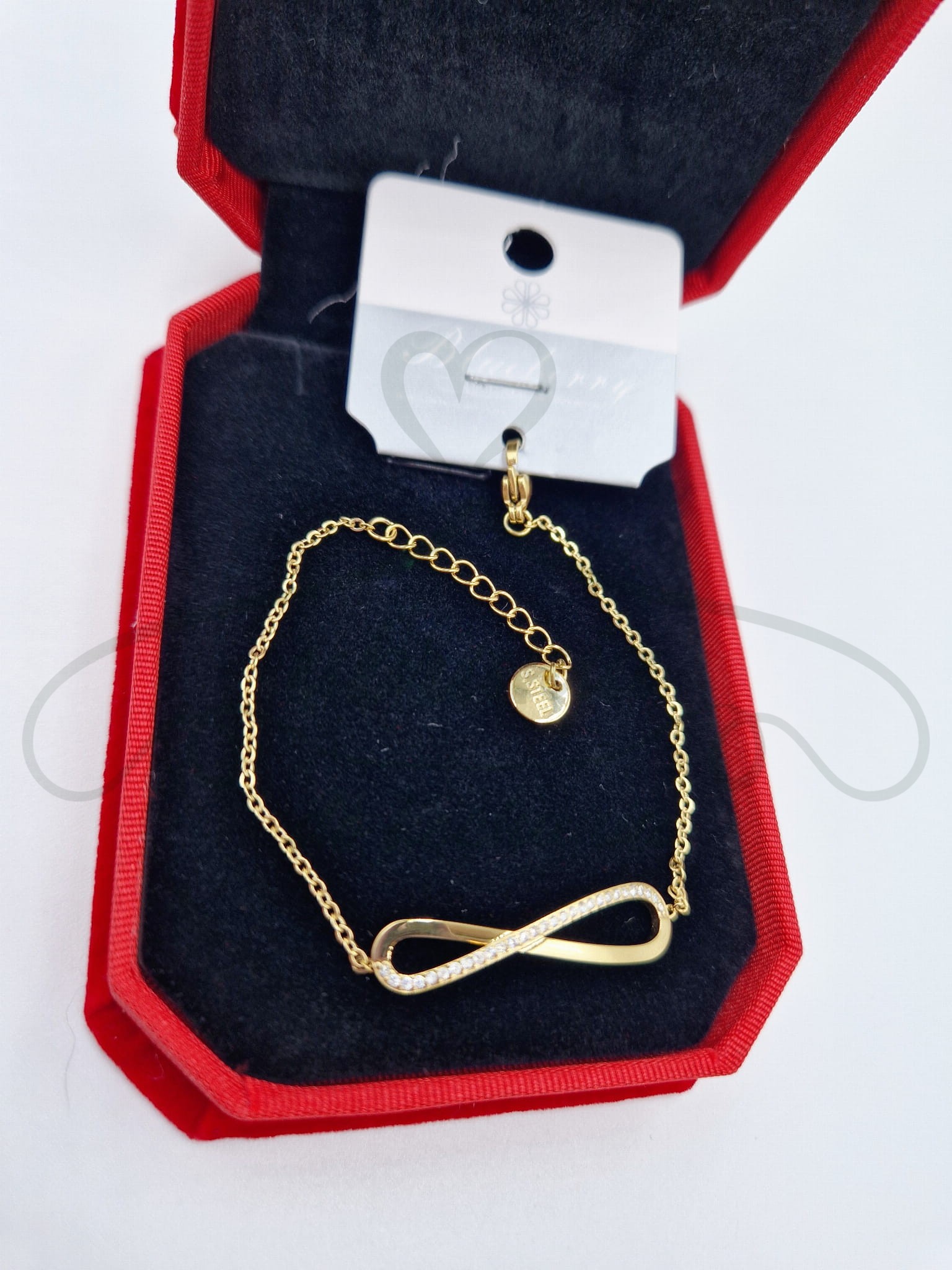 Niezwykła bransoletka z symbolem nieskończoności to oryginalny dodatek do codziennych stylizacji. Została wykonana z dbałością o szczegóły i ma śliczny, złoty kolor. Symbol nieskończoności został dodatkowo ozdobiony malutkimi cyrkoniami, które pięknie się błyszczą. Łańcuszek jest delikatny. Biżuteria ta doda uroku każdej kobiecie.