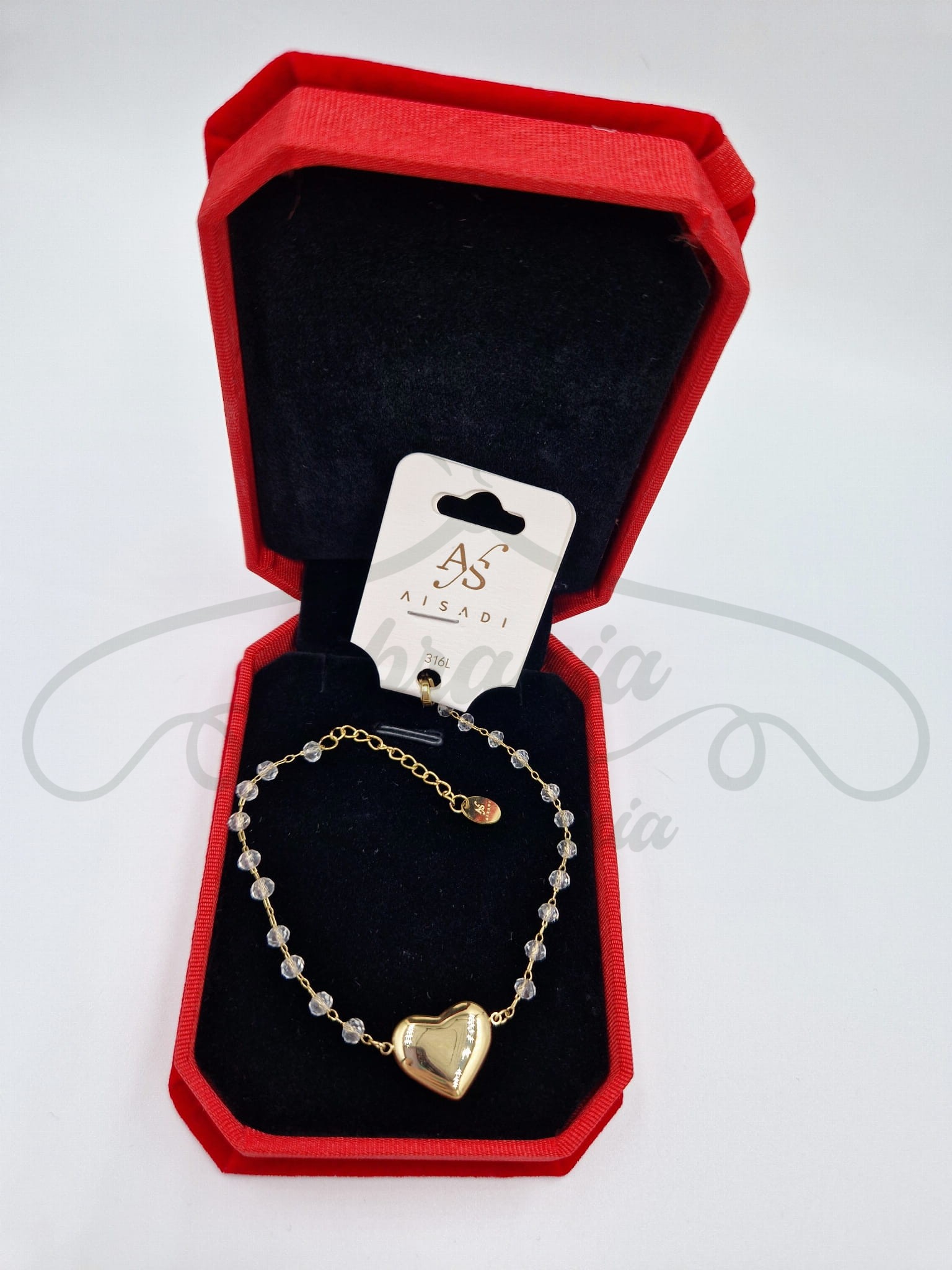 Bransoletka w kolorze złotym, z jasnym koralikiem oraz serduszkiem. Wykonana ze stali szlachetnej 316 L.