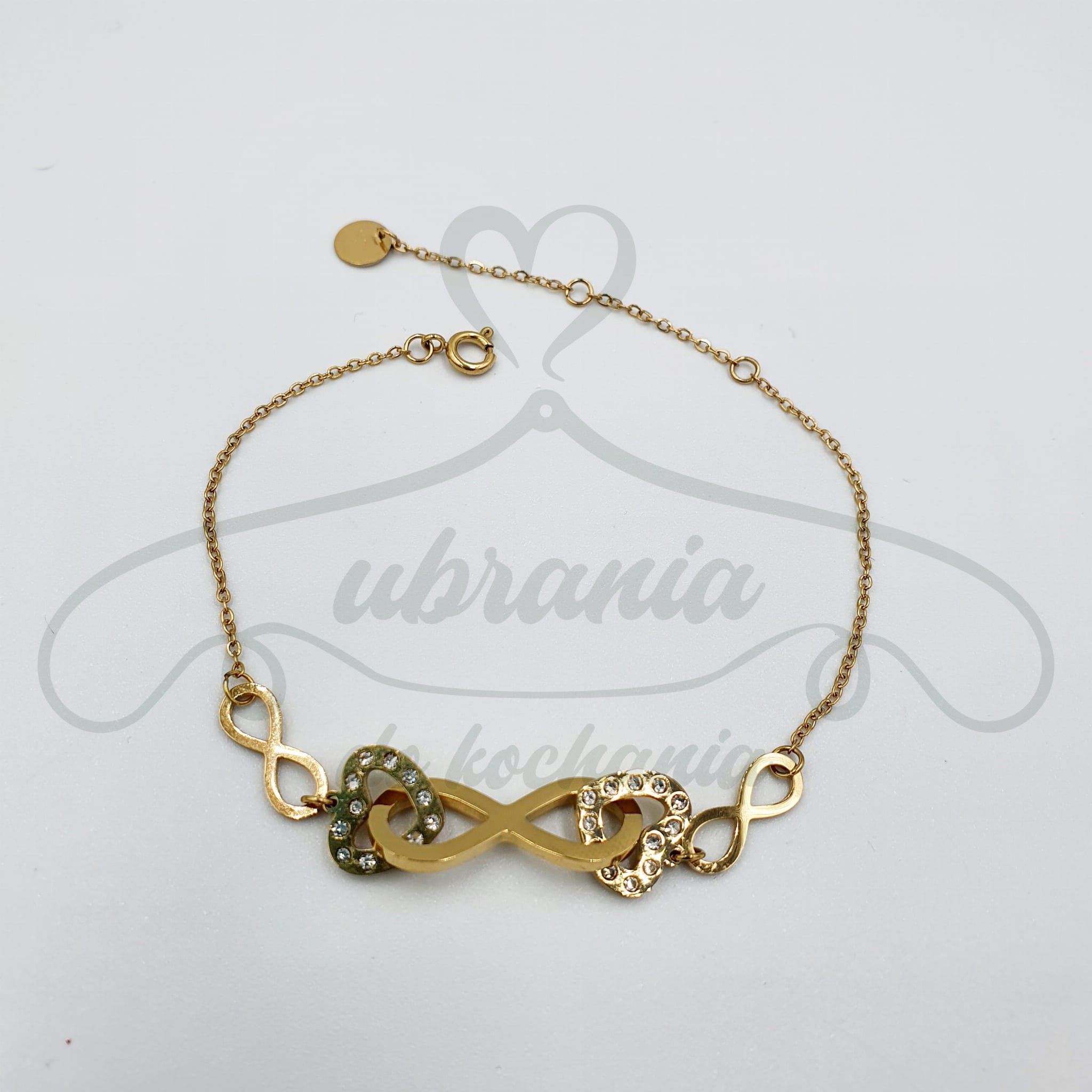 Bransoletka delikatna z nieskończonością oraz serduszkami w cyrkonie. Model uniwersalny, pasujący do każdej stylizacji, wykonany ze stali szlachetnej 316 L.