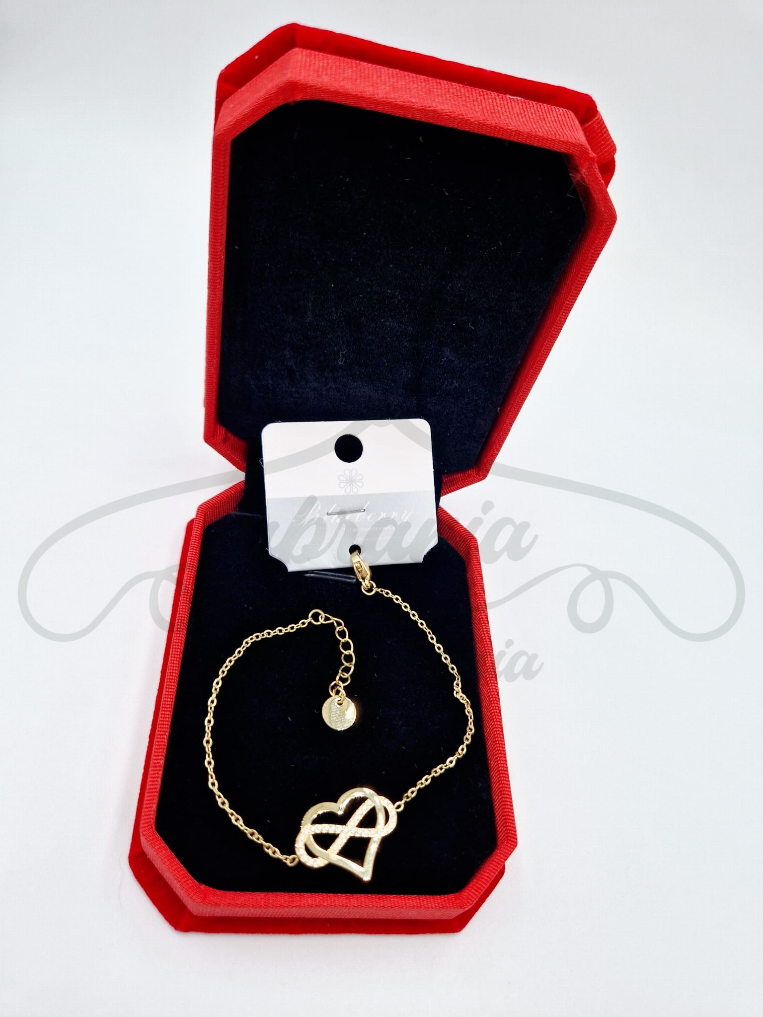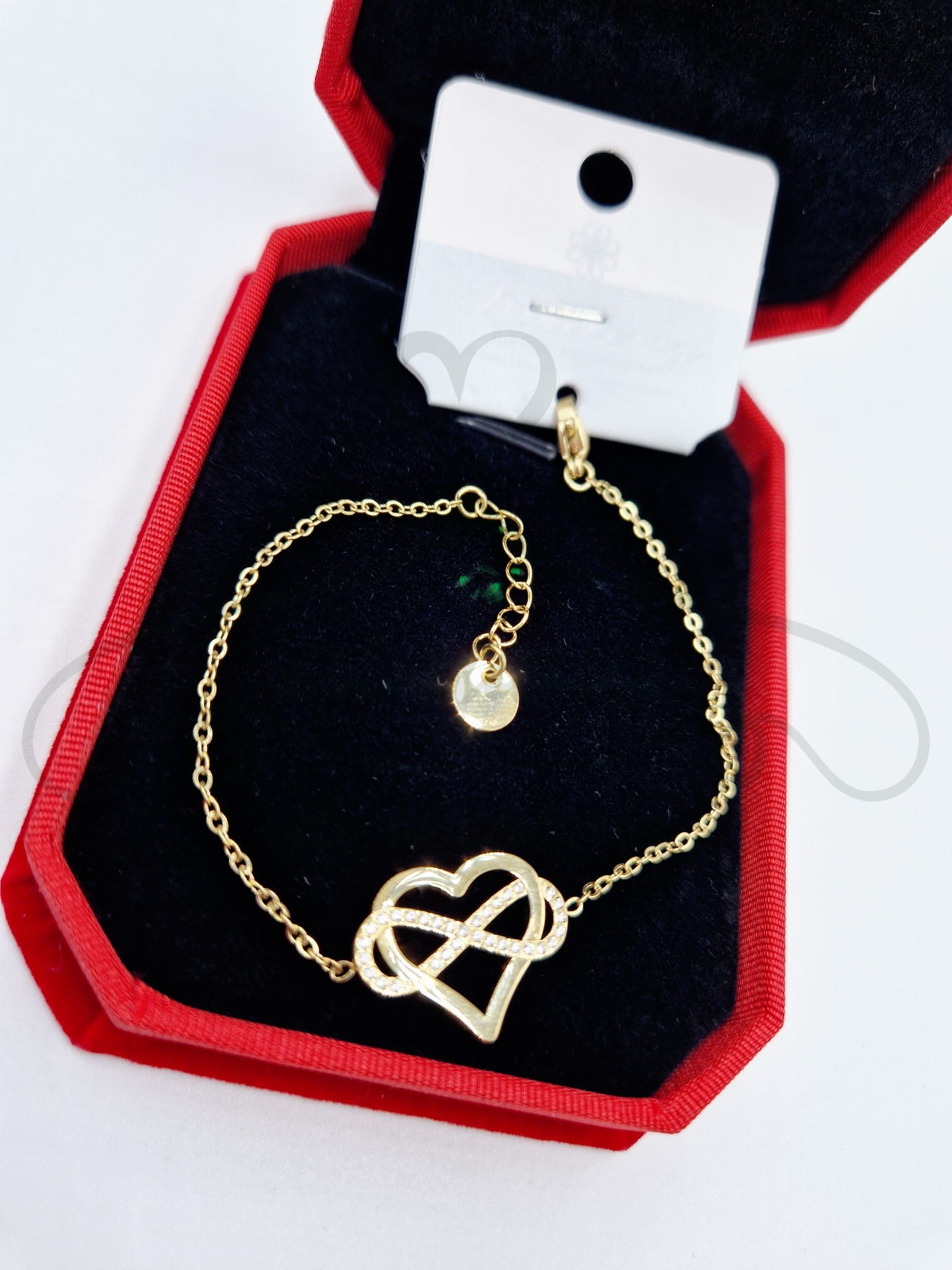 Piękna bransoletka z serduszkiem oplecionym w symbol nieskończoności, to dodatek dla romantyczek, które lubią oryginalne dodatki. Może symbolizować moc nieskończonej miłości i istnieje możliwość, że jego symbolika przyniesie właścicielce szczęście w miłości. Bransoletka jest w kolorze złotym, a symbol nieskończoności został dodatkowo ozdobiony malutkimi cyrkoniami, które pięknie się błyszczą.