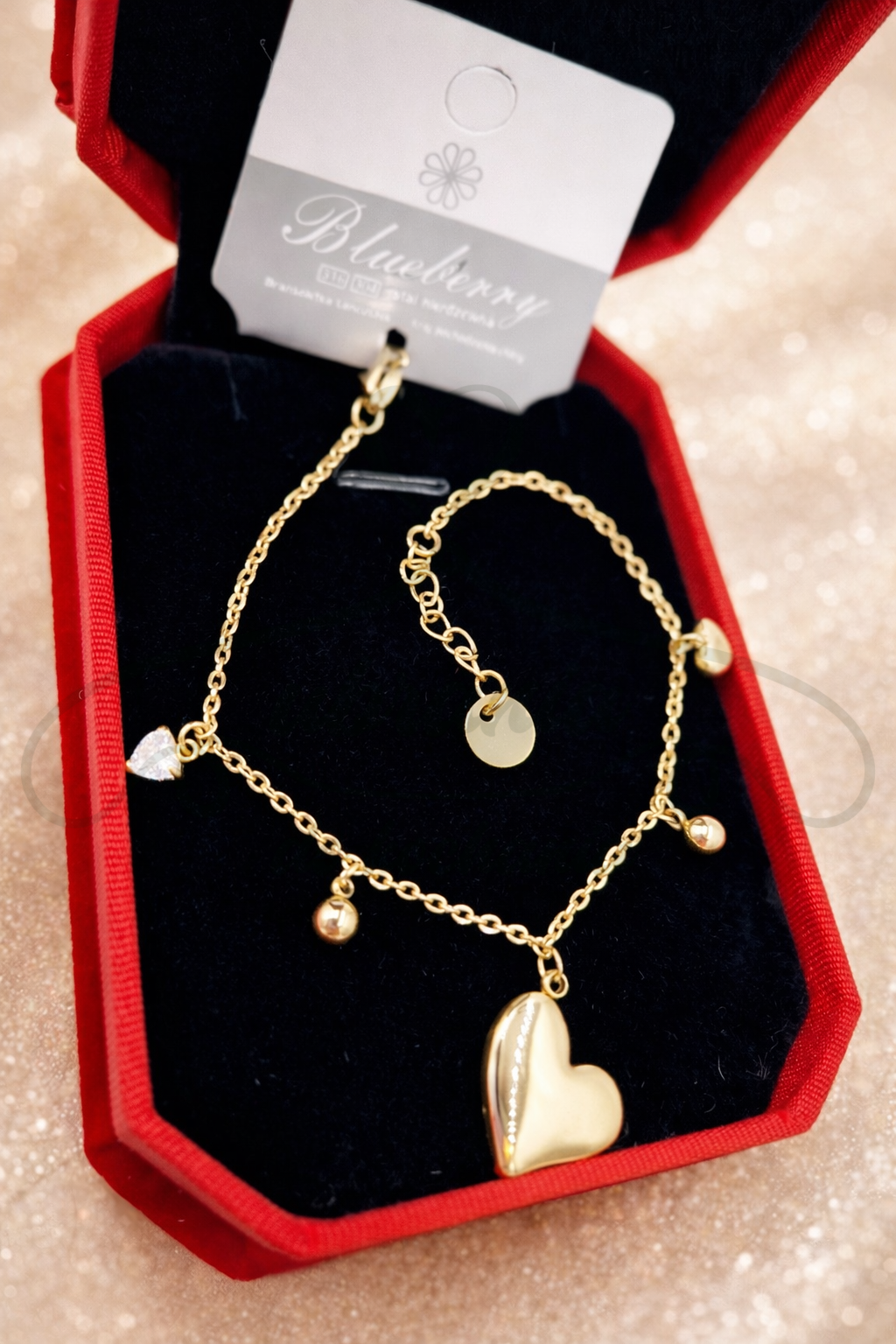 Piękna bransoletka w kolorze złotym z motywem serc, będzie pięknie wyglądać na nadgarstku prawdziwej romantyczki. Podkreśl swój niezwykły styl i romantyczną naturę, zakładając naszą biżuterię na każdą okazję. Nada się ona również na prezent dla wyjątkowej osoby.