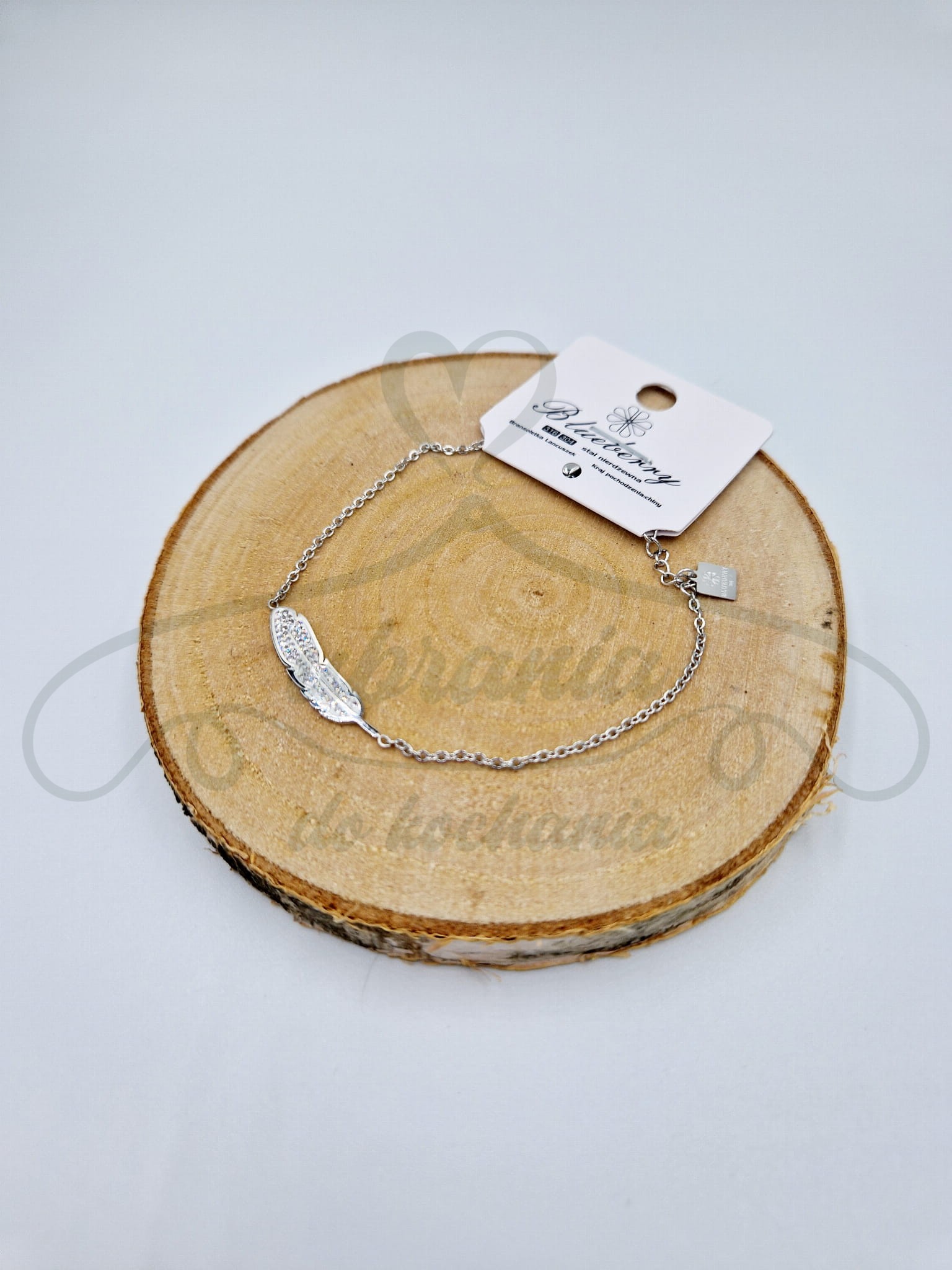Bransoletka w kolorze srebrnym z piórkiem zdobionym cyrkoniami. Wykonana jest ze stali szlachetnej 316 L. Idealny dodatek do każdej stylizacji.