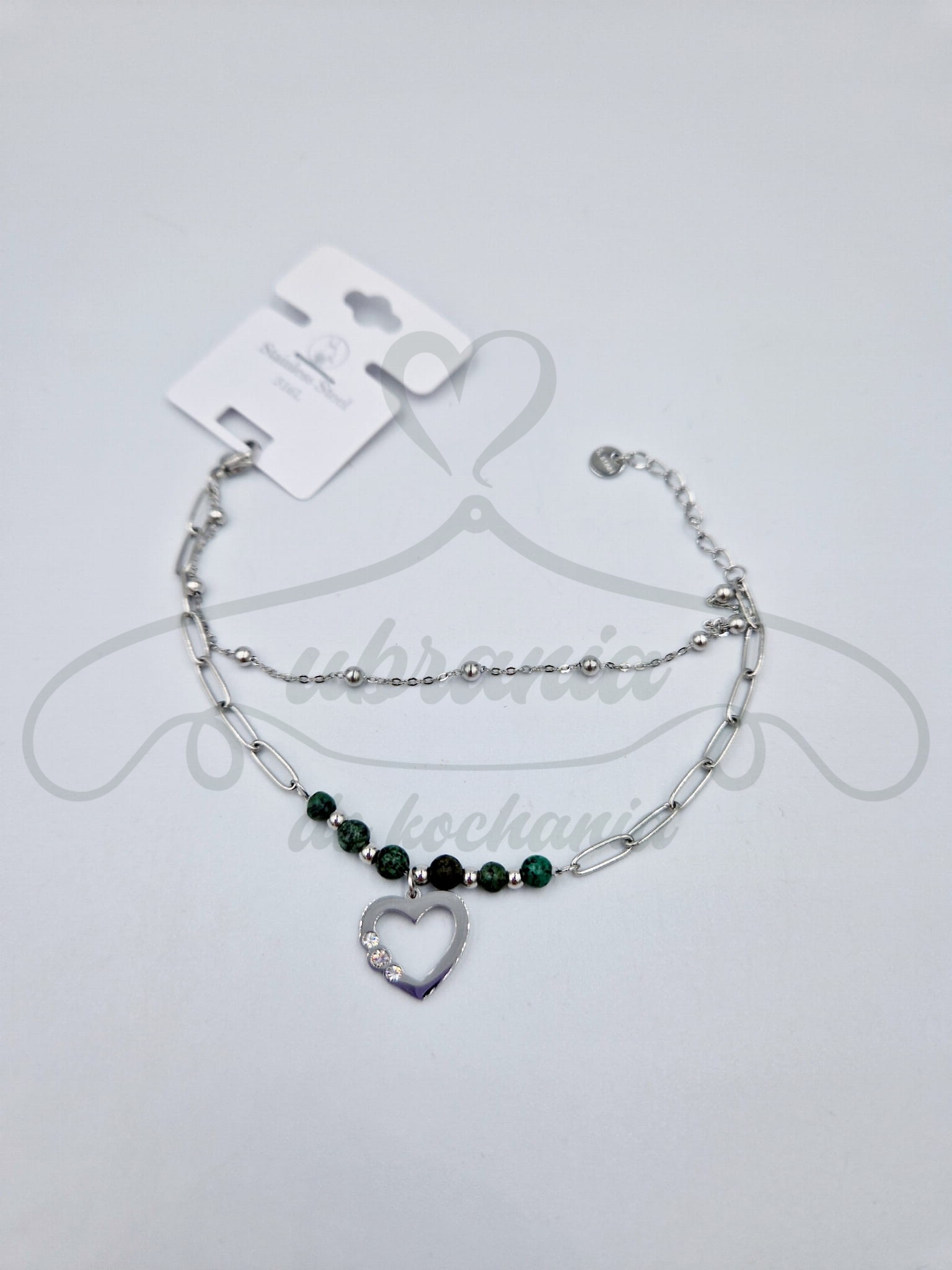 Bransoletka w kolorze srebrnym, podwójna z koralikami w kolorze zielonym oraz zawieszką sercem z cyrkoniami. Model ze stali szlachetnej 316 L, pasujący do każdej stylizacji.