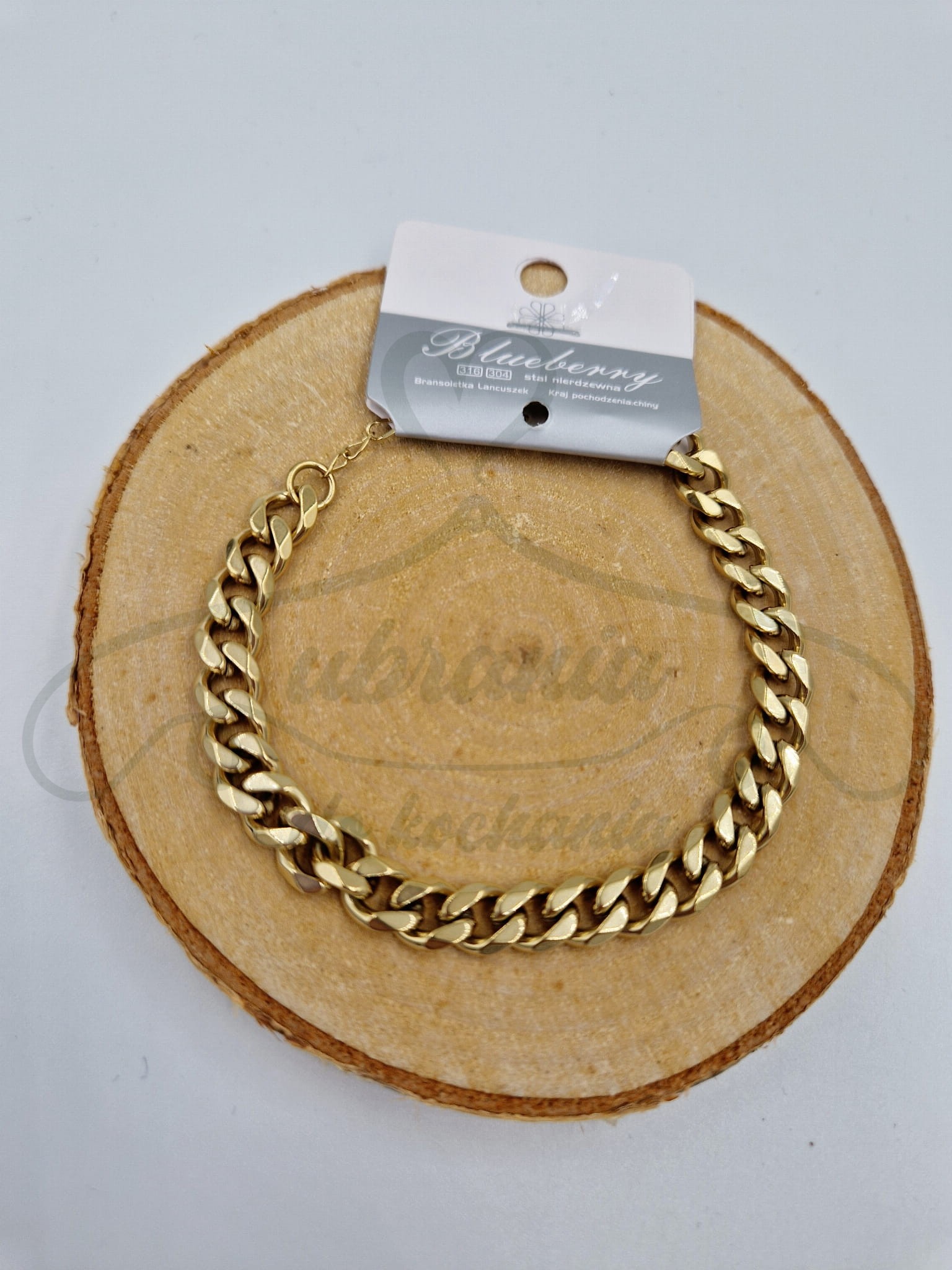 Piękna oraz widoczna na dłoni szeroka bransoletka w kolorze złotym wykonana z płaskiego ogniwa. Model wykonany z wysokiej jakości stali szlachetnej. Z powodzeniem podkreśli każdą stylizację!