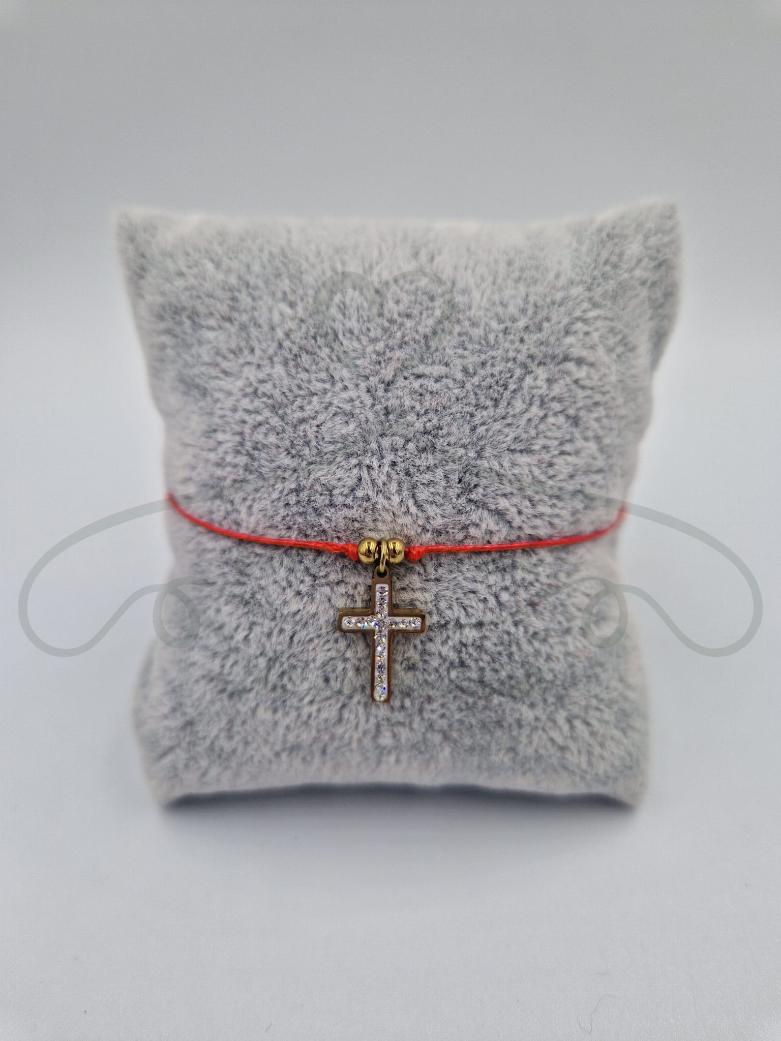 Delikatna bransoletka na cienkim czerwonym sznurku z krzyżykiem. Zwyczajowo przynosi szczęście i ma działanie ochronne. Chroni przed negatywnymi doświadczeniami życiowymi i złą energią. Model pasujący na każdy nadgarstek. Subtelny dodatek dla każdej kobiety ceniącej piękne i modne akcesoria. Złote elementy wykonane ze stali szlachetnej.