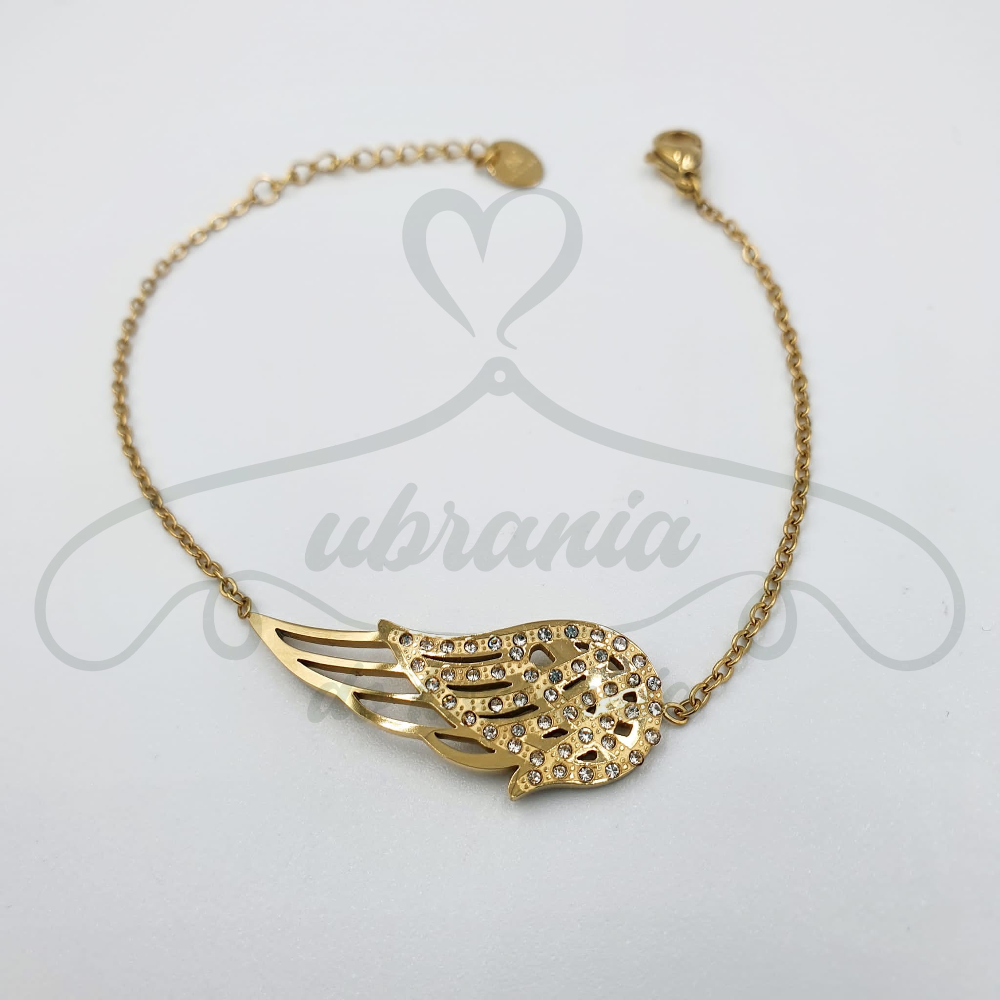 Bransoletka skrzydło w kolorze złotym zdobiona cyrkoniami wykonana z wysokiej jakości stali chirurgicznej 316L.