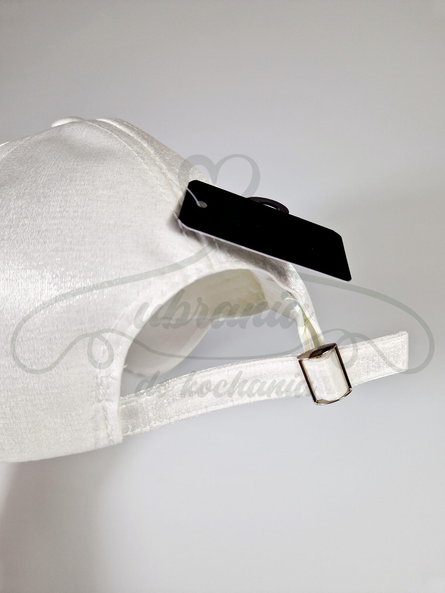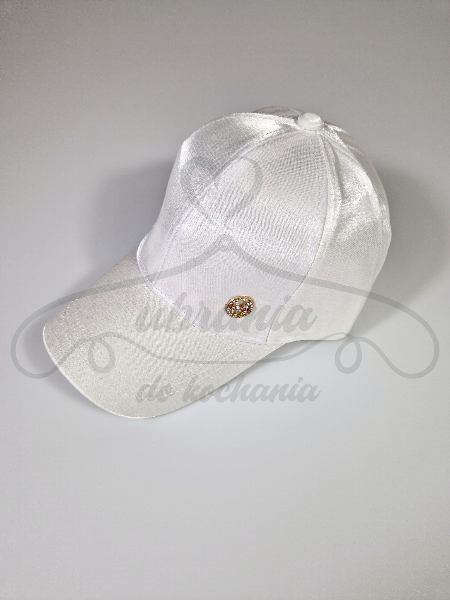 Czapka z daszkiem damska w kolorze białym z cyrkonią na przodzie, posiada regulację z tyłu.