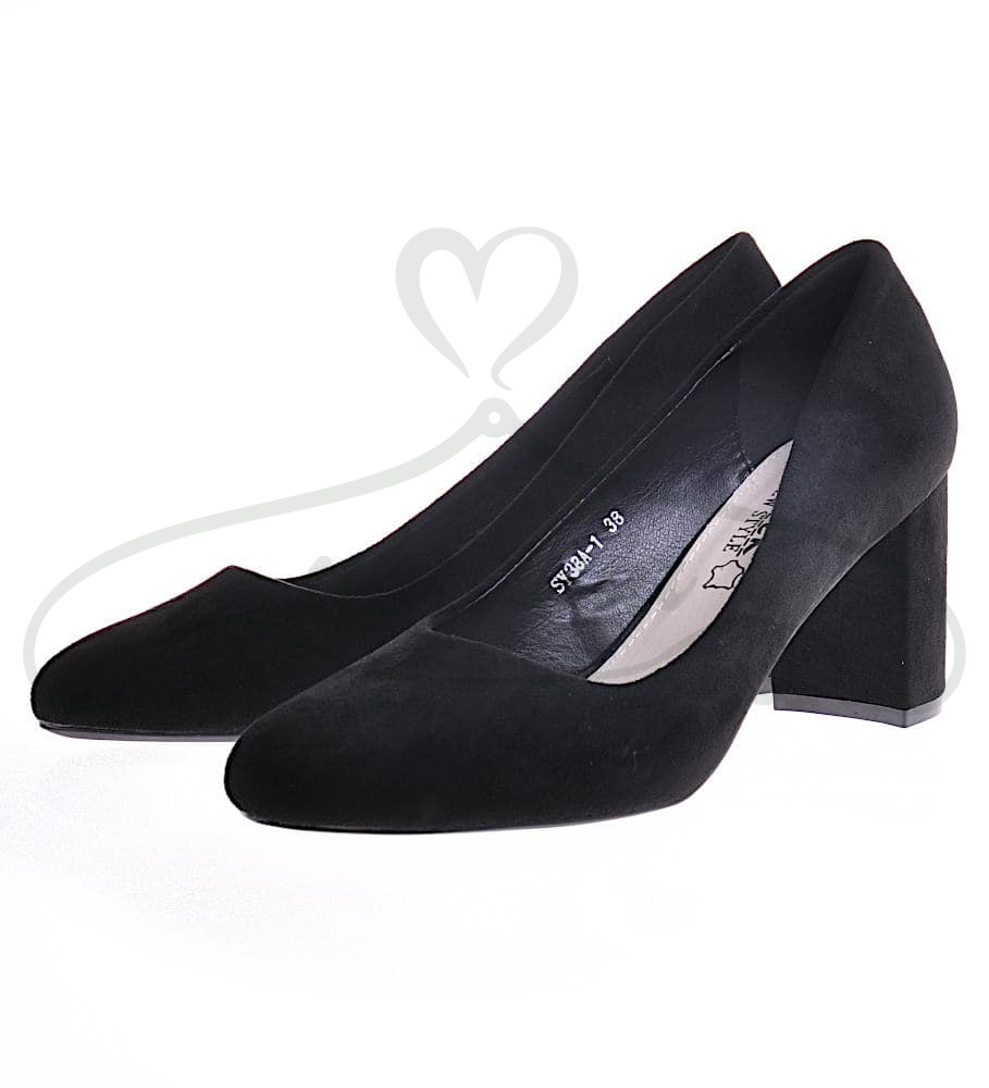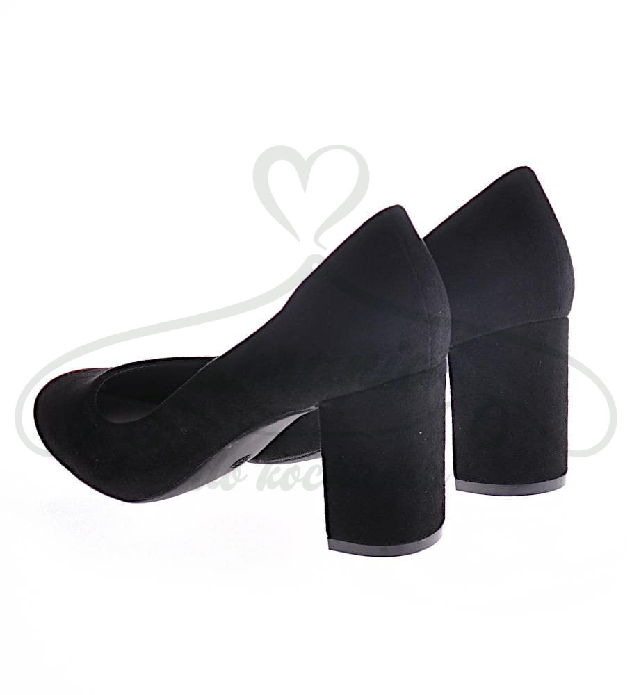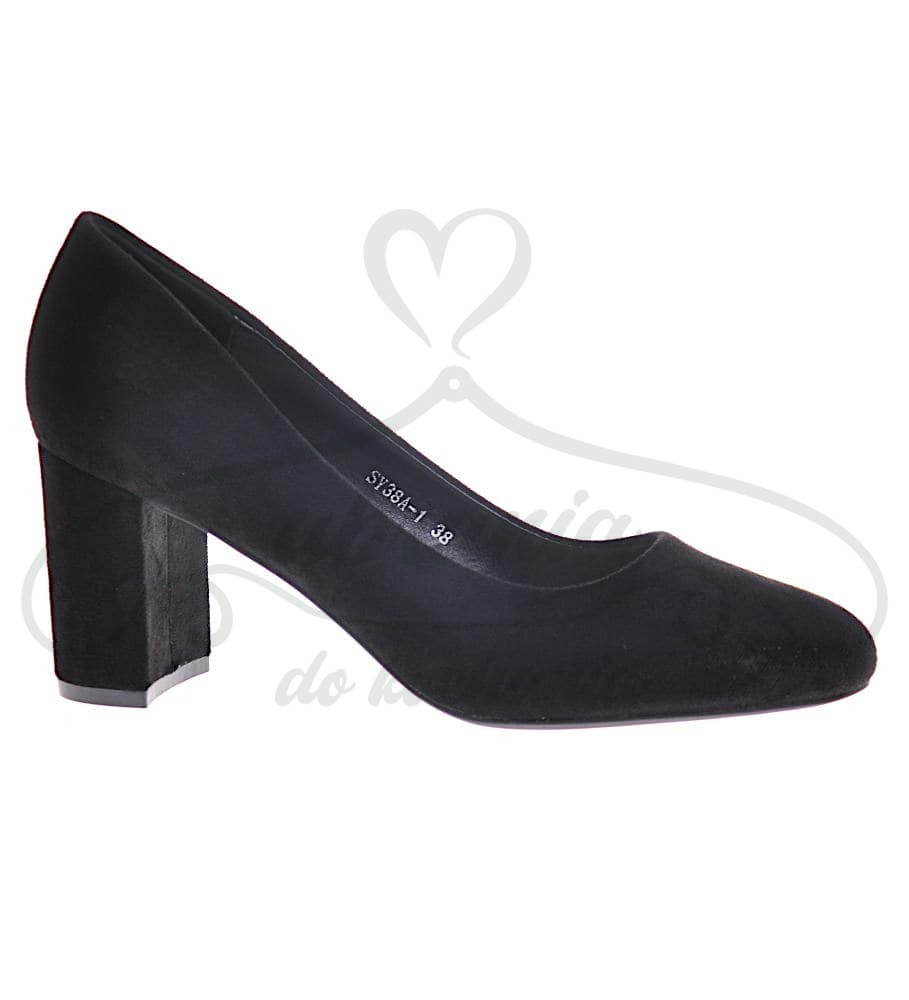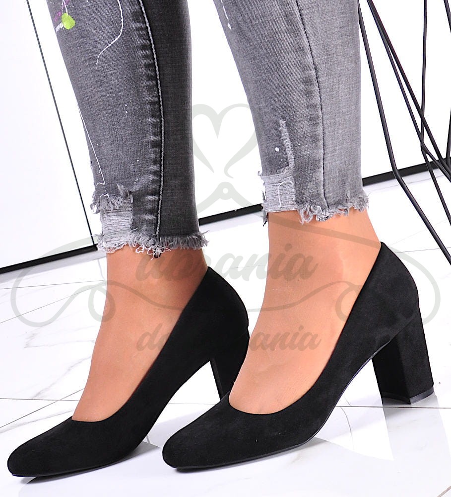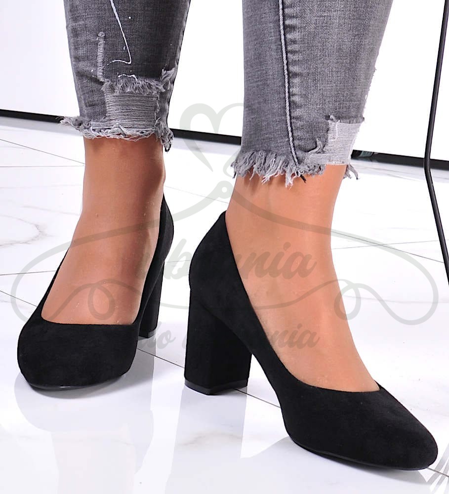 Klasyczne czółenka damskie czarne, zamszowe z zaokrąglonym przodem. Model na komfortowym słupku wysokości 8 cm. Idealnie uzupełnią każda elegancką stylizacje.