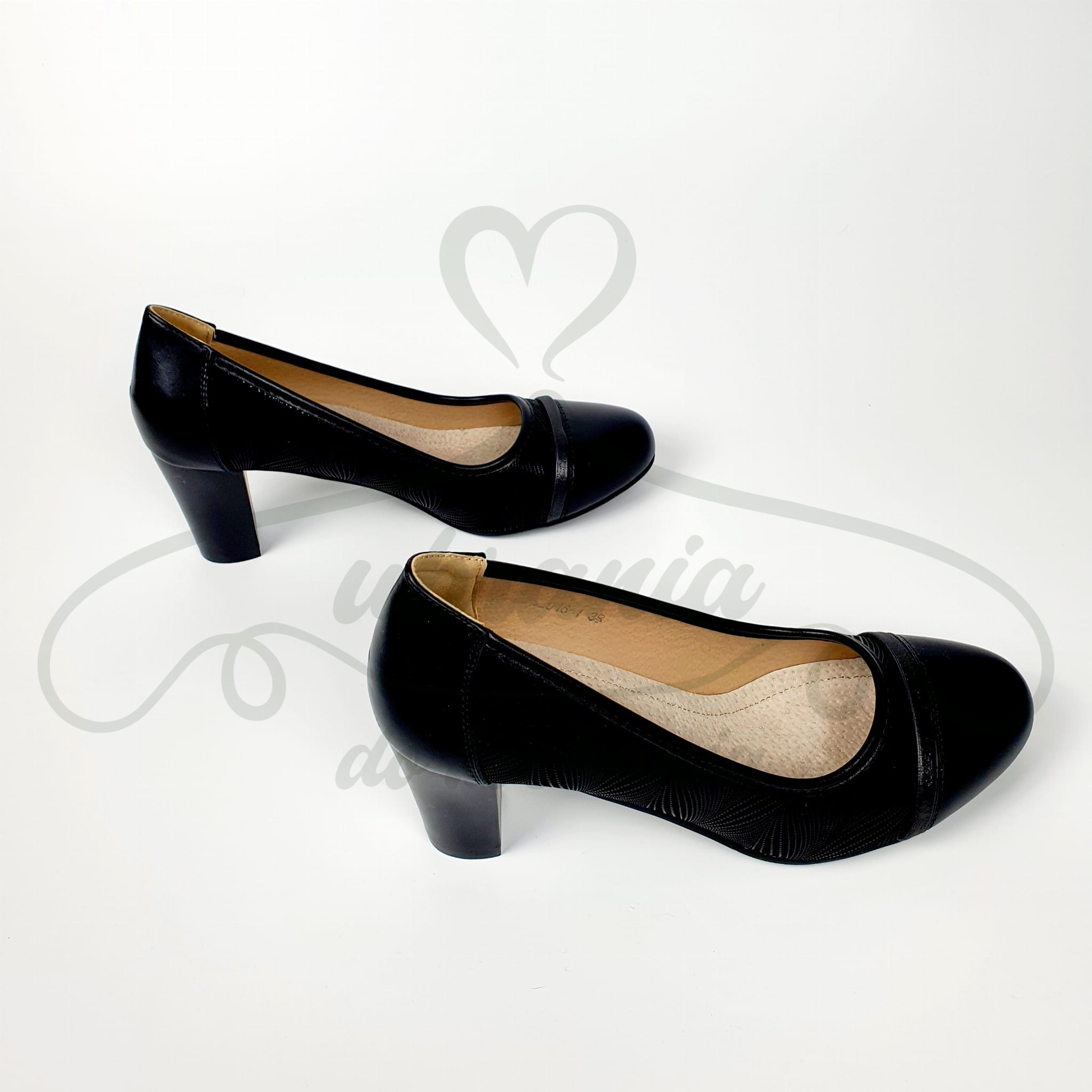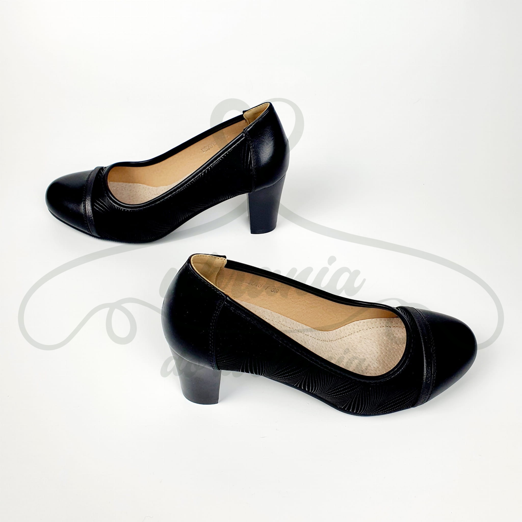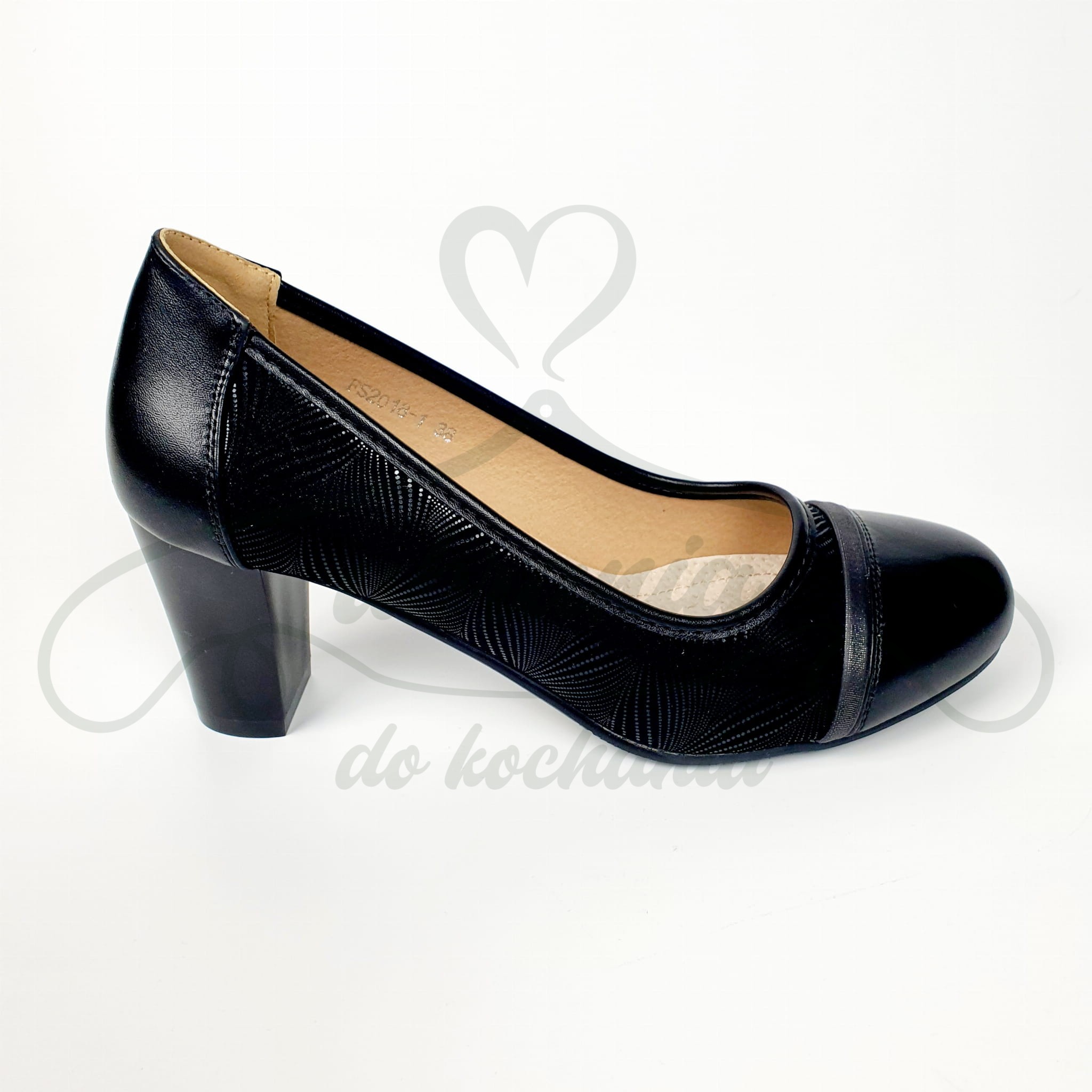 Klasyczne czółenka damskie czarne z zaokrąglonym noskiem wykonane ze skóry ekologicznej. Pokryte delikatnym tłoczkiem i na komfortowym słupku wysokości 6,5 cm. Idealnie uzupełnią każda elegancką stylizacje.