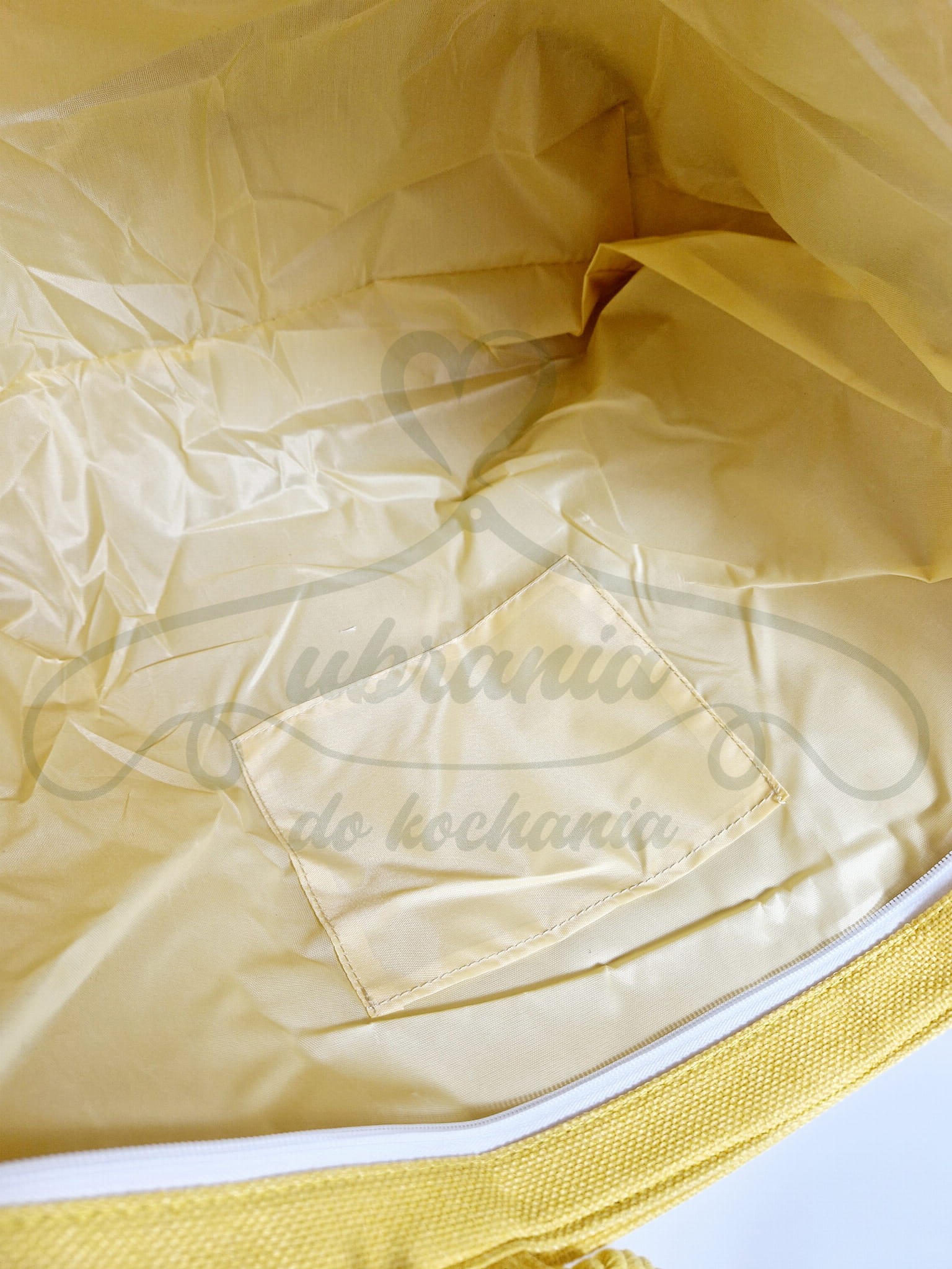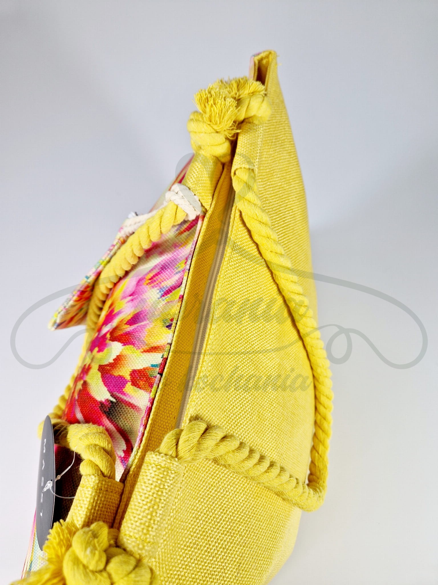 Plażowa torebka zapinana na zamek błyskawiczny. Wykonana z wytrzymałego materiału z wakacyjnym kolorowym wzorem 3d. Zawieszona na dwóch plecionych uchwytach. W środku mała kieszonka na drobiazgi. Idealna na plażę, podszewka jest w kolorze beżowym. Torba dodatkowo posiada mała kosmetyczkę na zamek. Spokojne zmieścimy do torby wszystkie niezbędne rzeczy na plażę m in. ręcznik, kremy, klapki itp. Torba pomieści A4.