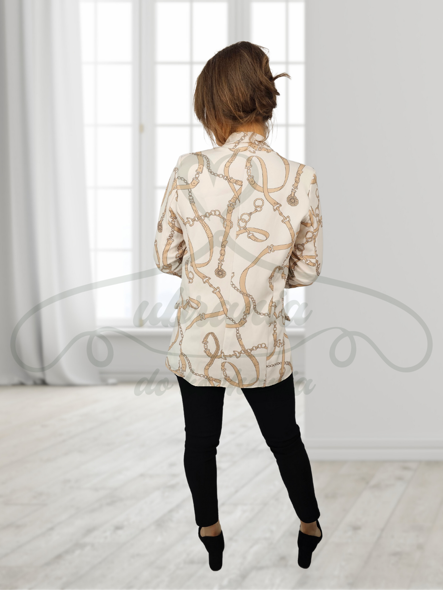 Elegancka marynarka o prostym fasonie w kolorze ècru zdobiona motywem pasków i łańcuchów z rękawem 3/4 zakończonym delikatnymi marszczeniami materiału, dzięki czemu poza klasycznym wyglądem ma nutkę nowoczesności. Przyjemna w dotyku i wygodna. Posiada klasyczny szalowy kołnierz oraz symetrycznie z dwóch stron atrapy kieszeni. Od wewnątrz wykończona białą podszewką.