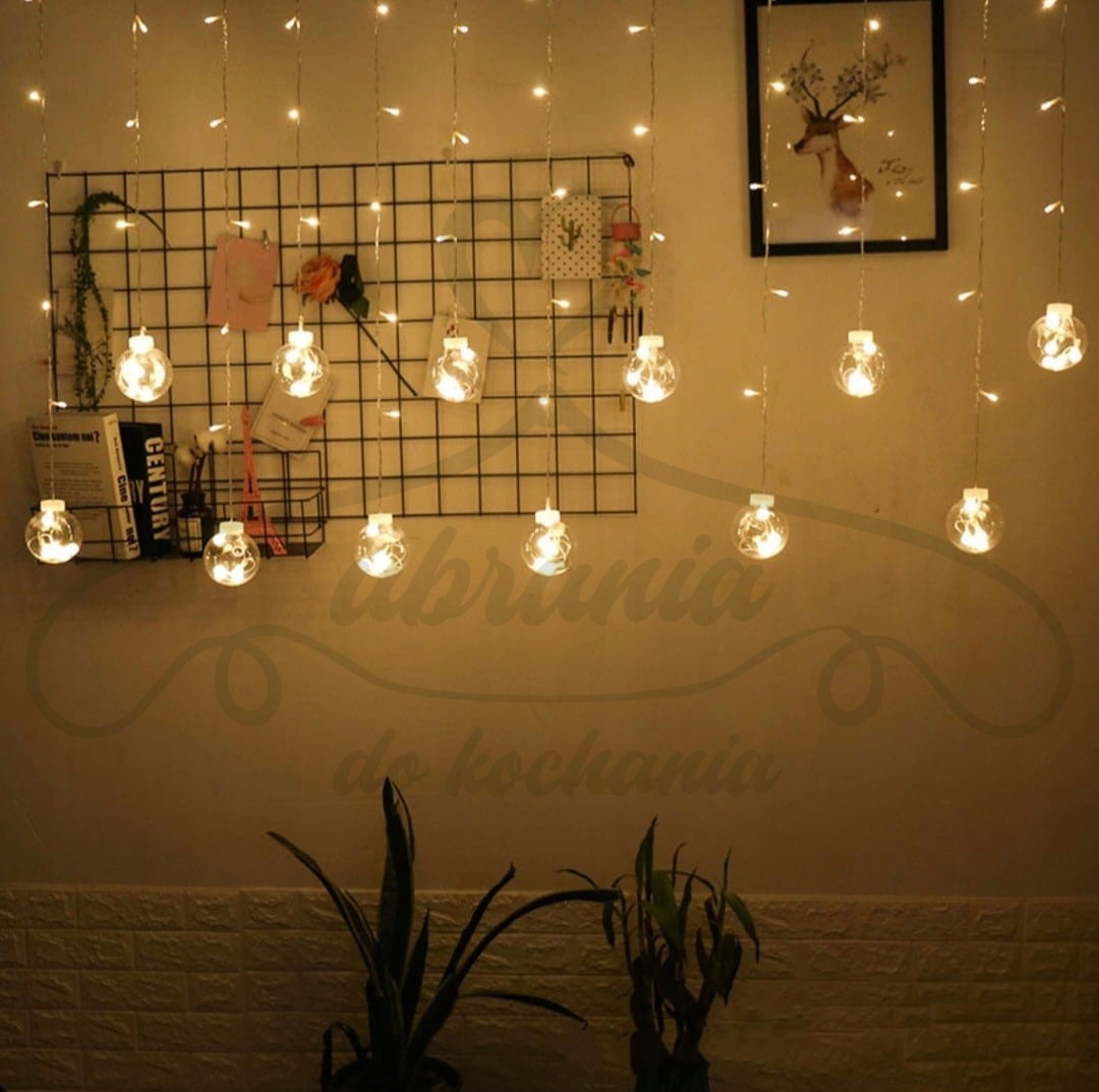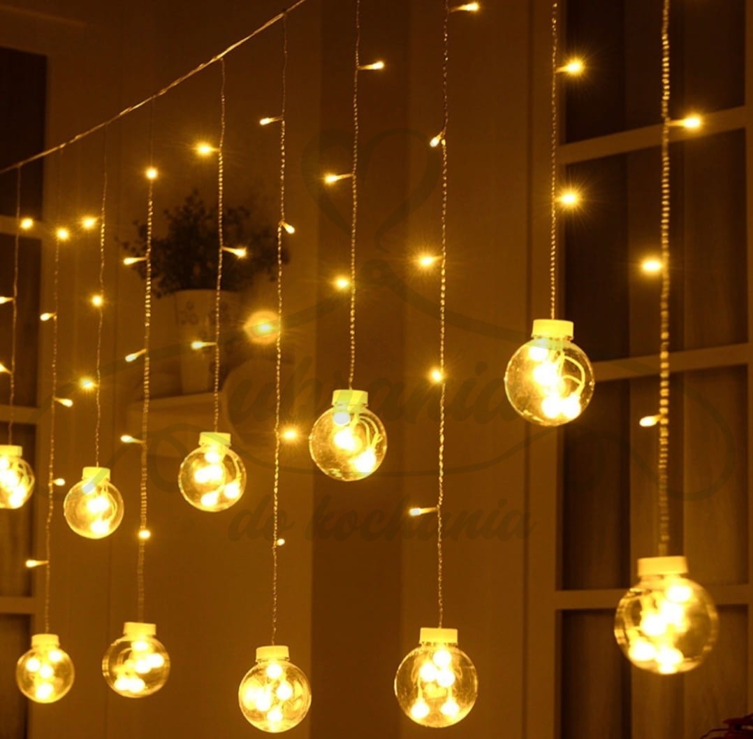 Kurtyna świetlna złożona z pionowyvh zwisających przewodów na których umieszczone są energooszczędne diody mikro LED z przezroczystymi kulami. Lampki zostały umieszczone na wytrzymałym, grubym kablu, co gwarantuje długą żywotność. Dzięki technologii LED lampki nie pobierają dużo prądu. Delikatnie kołyszące się w oknie wprowadzą magiczny klimat do naszego domu.
