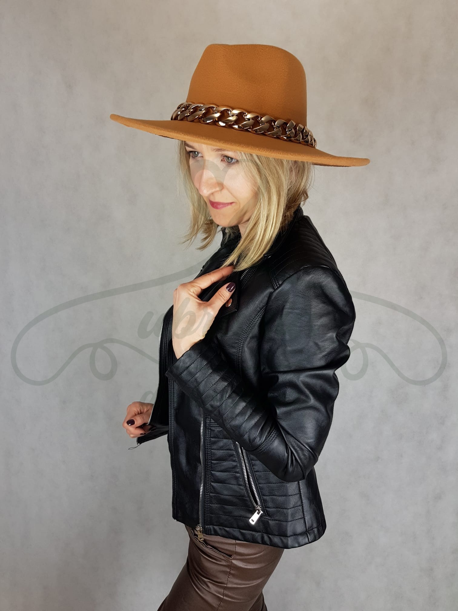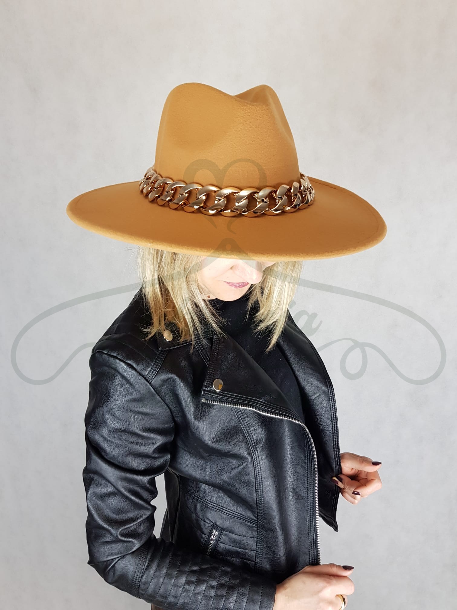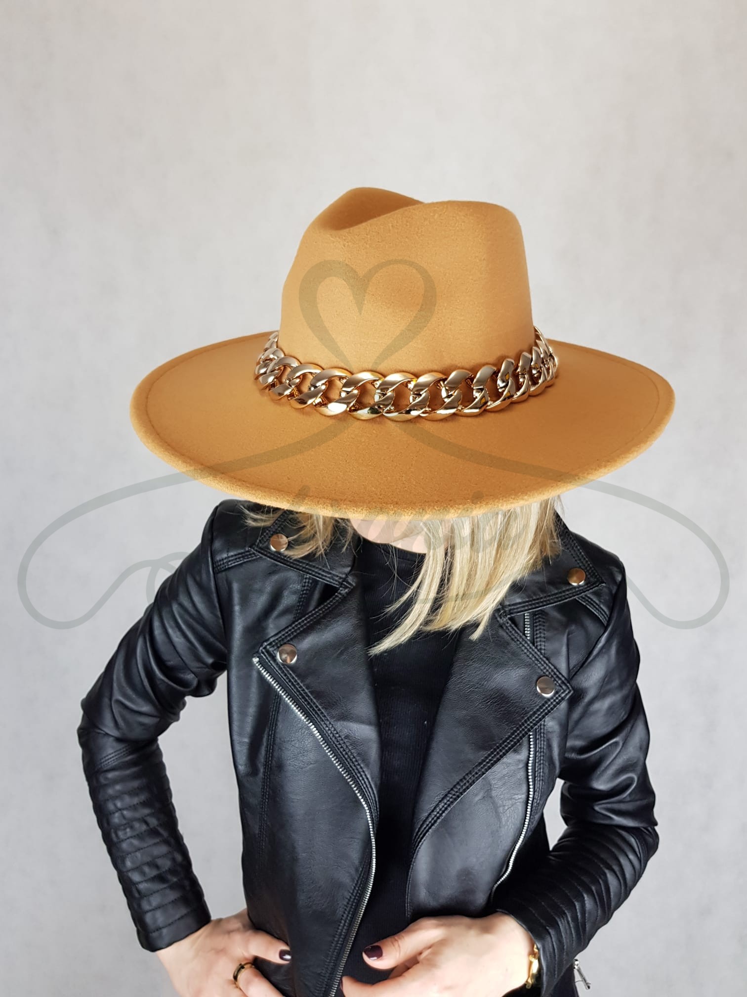 Starannie wykonany kapelusz z ozdobnym łańcuszkiem będzie ozdobą twojej stylizacji na każdą okazję; inspirowany światowymi projektami największych twórców mody. Kapelusz w kolorze camelowym z szerokim rondem, idealny dodatek do każdej stylizacji. Rondo kapelusza zdobione złotym łańcuchem Kapelusz wykonany jest z przyjemnego w dotyku materiału i wygląda zjawiskowo, a proste rondo i idealne proporcje sprawiają, że świetnie się układa. Dzięki specjalnym wstążką zamontowanym od wewnątrz istnieje możliwość regulacji rozmiaru dopasowując go wedle własnych potrzeb.