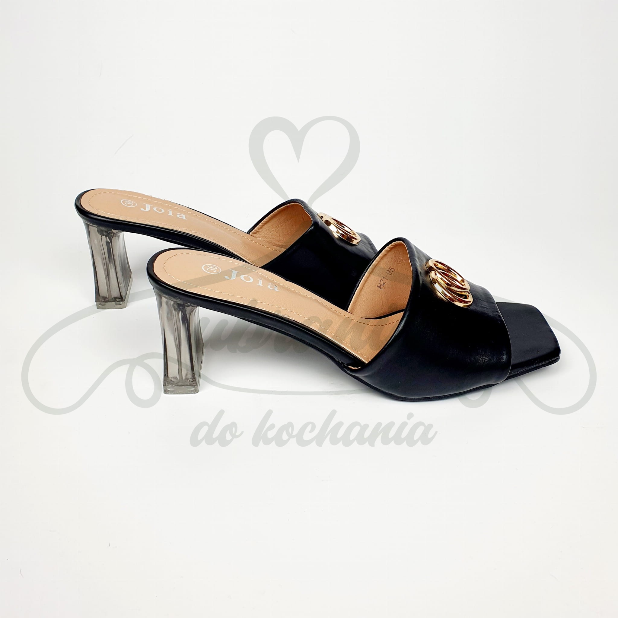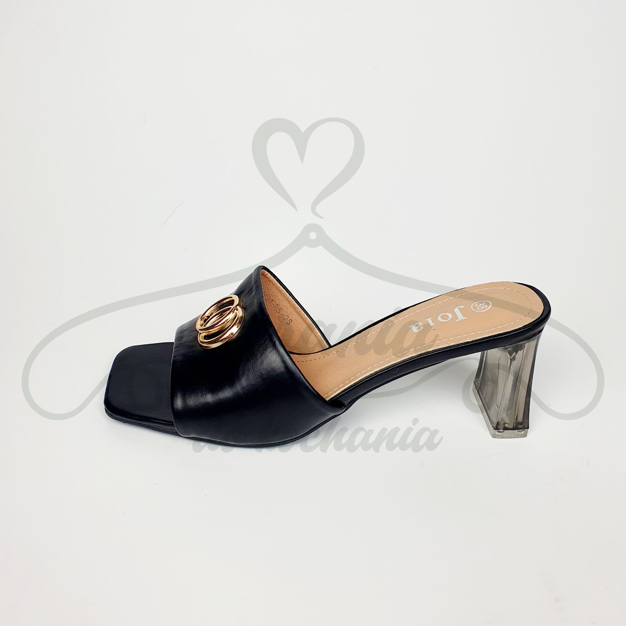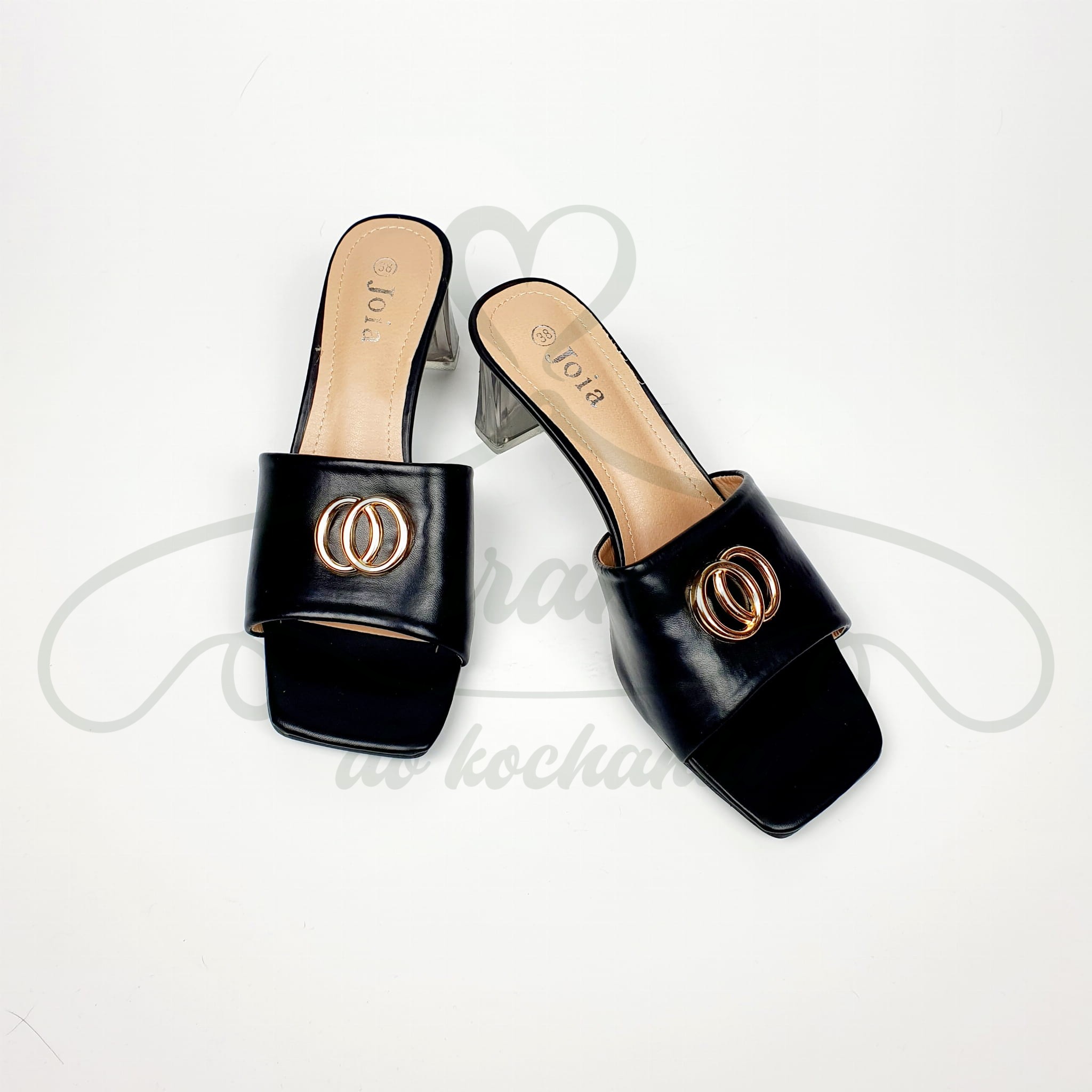 Eleganckie klapki w kolorze czarnym na transparentnym obcasie o oryginalnym kształcie. Buty wykonane ze skóry ekologicznej i zdobione na przodzie złotymi kółkami. Bardzo wygodne a zarazem eleganckie i dodatkowego szyku dodaje im obcas na słupku wysokości 7 cm. Doskonale wydłużą nogi! Idealne do sukienek i spódnic.