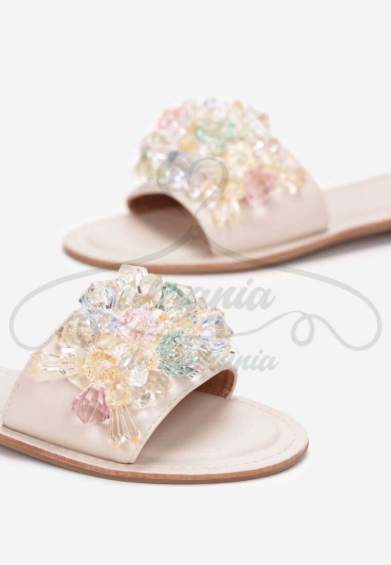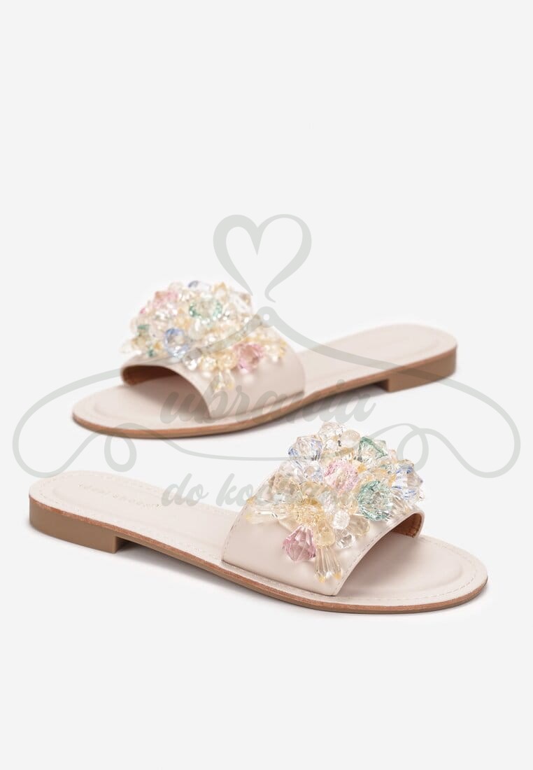 Klasyczne klapki osadzone na płaskim obcasie z antypoślizgową podeszwą. Model ten z pewnością przypadnie do gustu każdej kobiecie ceniącej sobie styl oraz wygodę. Klapki zostały ozdobione mieniącymi się, kolorowymi kamieniami. Miękka wkładka została wykonana z eko skóry i pozwoli na komfortowe użytkowanie obuwia nawet przez cały dzień.
