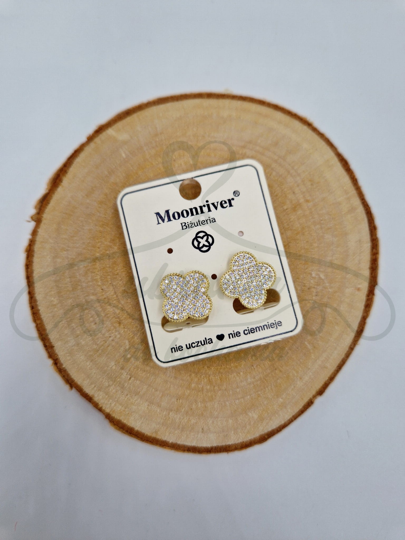 Subtelne i eleganckie klipsy w kształcie czteropłatkowego kwiatu, w całości pokryte drobnymi, połyskującymi cyrkoniami. Wykonane ze stali szlachetnej w kolorze złotym – nie uczulają i nie ciemnieją, zapewniając trwałość oraz komfort noszenia.