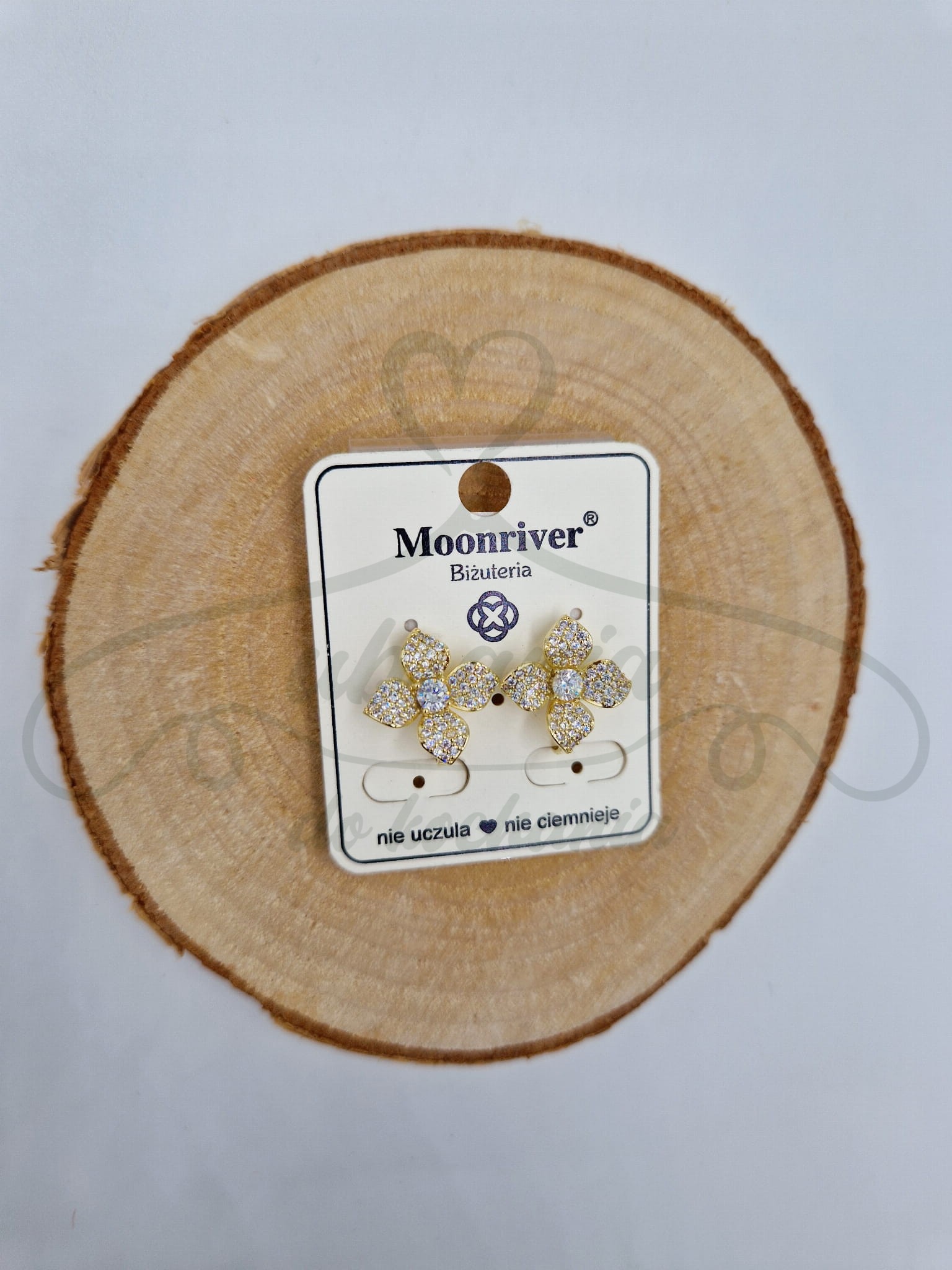 Ekskluzywne klipsy od marki Moonriver to propozycja dla kobiet ceniących elegancję i wygodę bez konieczności przekłuwania uszu. Wzór inspirowany klasycznym motywem kwiatowym został wzbogacony o lśniące cyrkonie, które pięknie odbijają światło i nadają całości luksusowego charakteru. Każdy z czterech płatków wysadzany jest drobnymi kamieniami, a centralny kryształ efektownie wieńczy kompozycję.