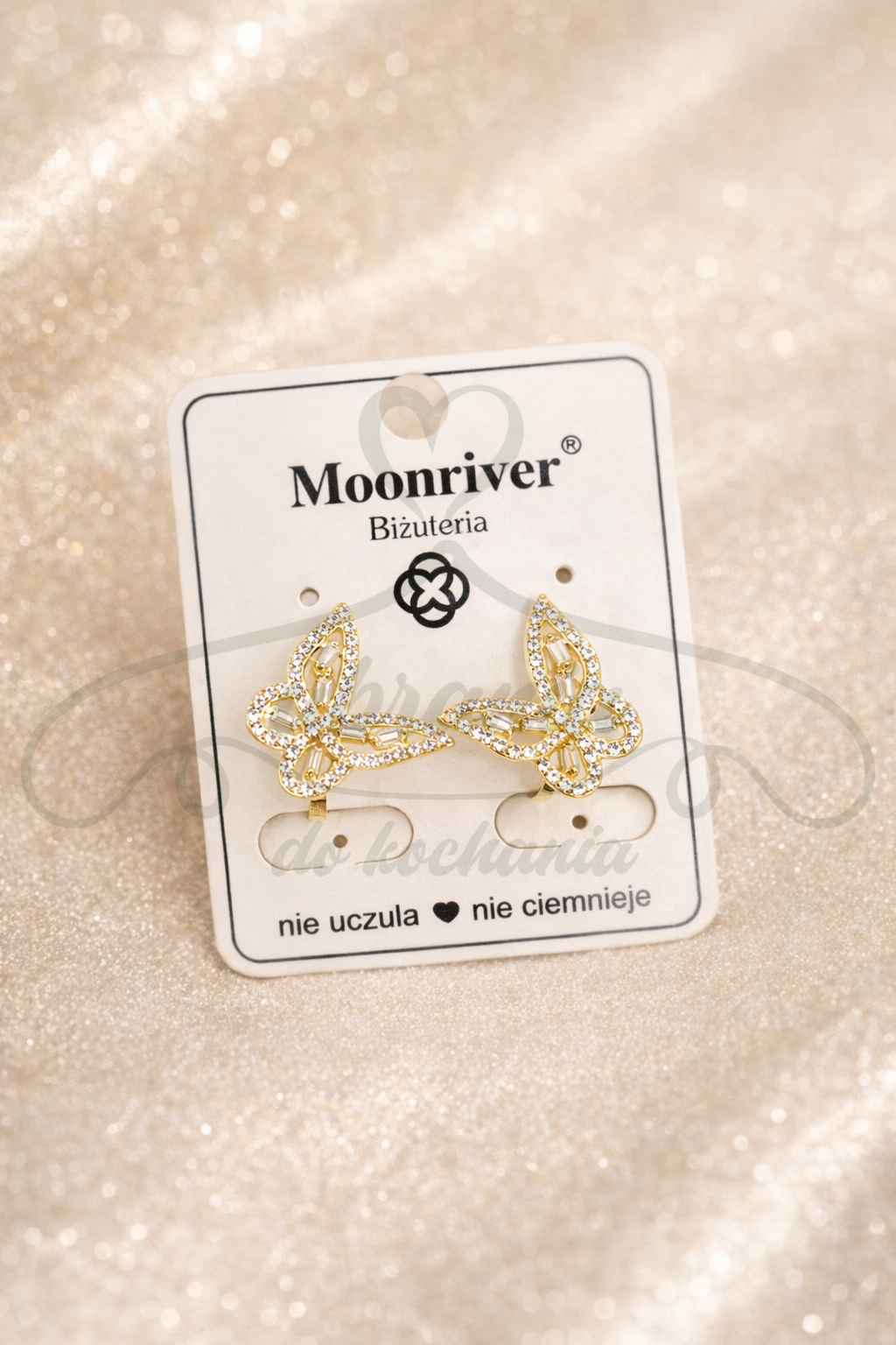 Delikatne klipsy w kształcie motylków, wykonane ze stali szlachetnej w złotym kolorze i ozdobione połyskującymi cyrkoniami. Ażurowa forma nadaje im lekkości, a błysk kamieni dodaje elegancji.