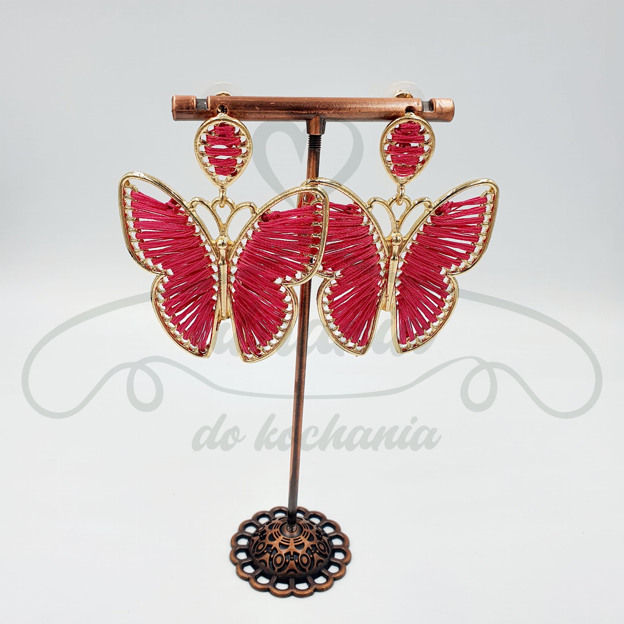 Kolczyki w kolorze złotym z plecionymi różowymi motylami. Bardzo fajny i kolorowy model. Biżuteria sztuczna, nie zawiera niklu.