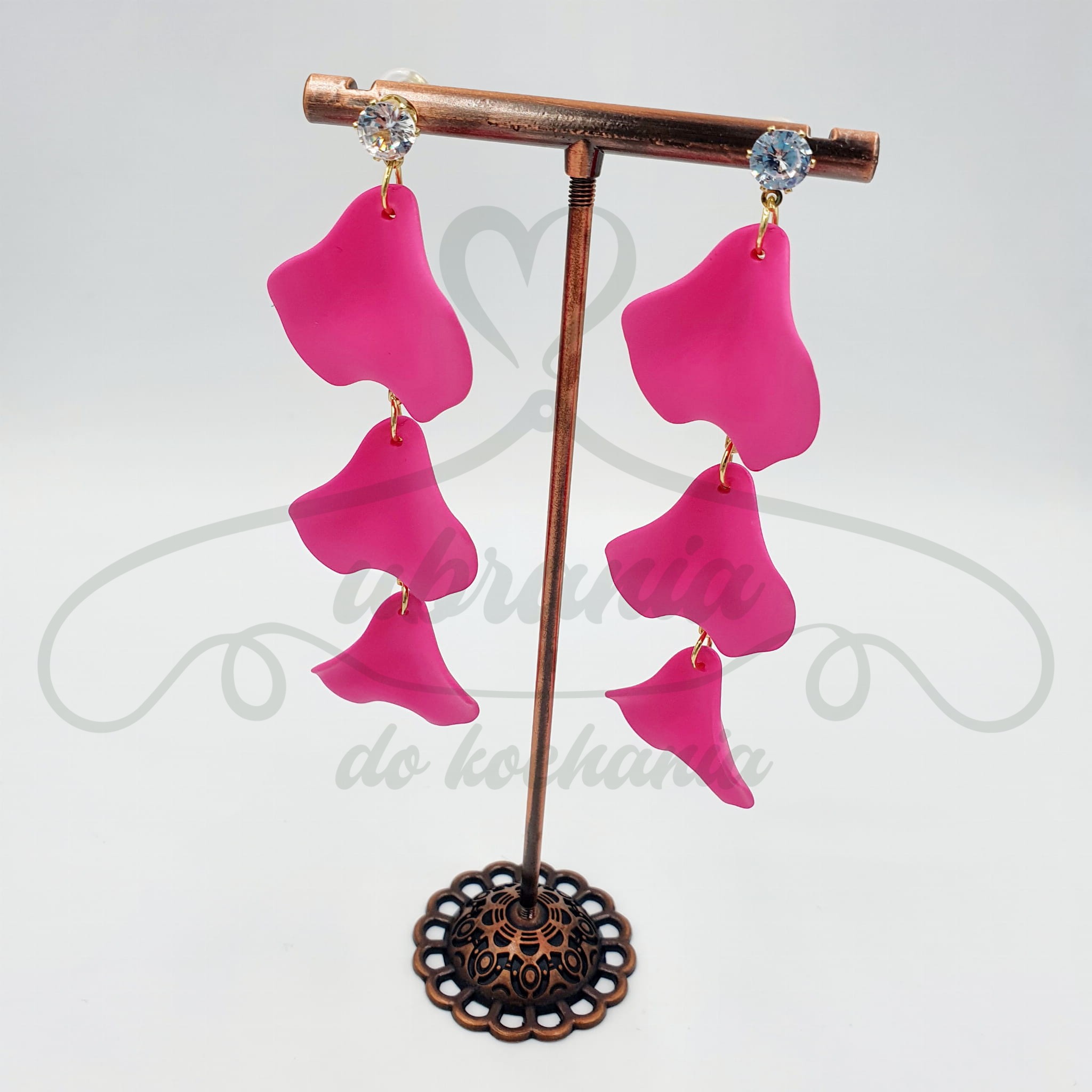 Kolczyki akrylowe listki w kolorze różowym wiszące z ładną cyrkonią, posrebrzane. Jest to hit tego lata, idealnie pasujący do letnich stylizacji.