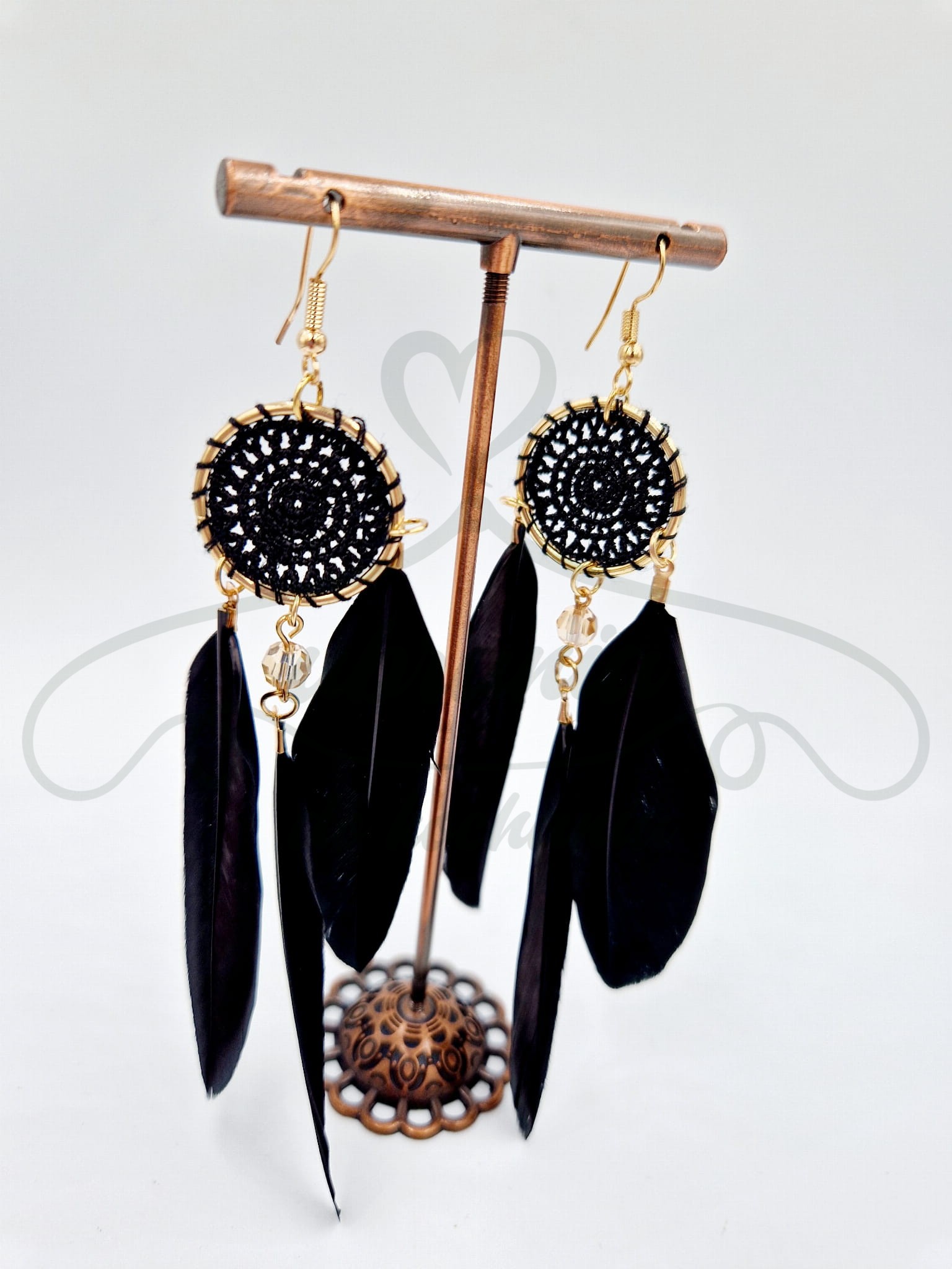 Kolczyki łapacze w kolorze złotym zdobione czarnymi, lekkimi piórami. Idealnie nadające się do letnich stylizacji i prawdziwy HIT tego sezonu! Materiał nieszlachetny.