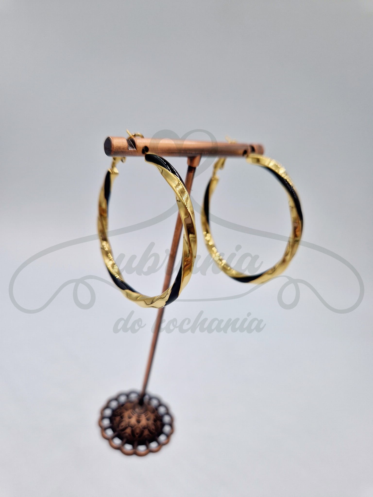 Kolczyki ze stali szlachetnej w formie skręcanych kół, łączące połyskliwe złoto z czarnym akcentem. Lekka forma i ciekawy efekt wizualny dodają im wyjątkowego charakteru.