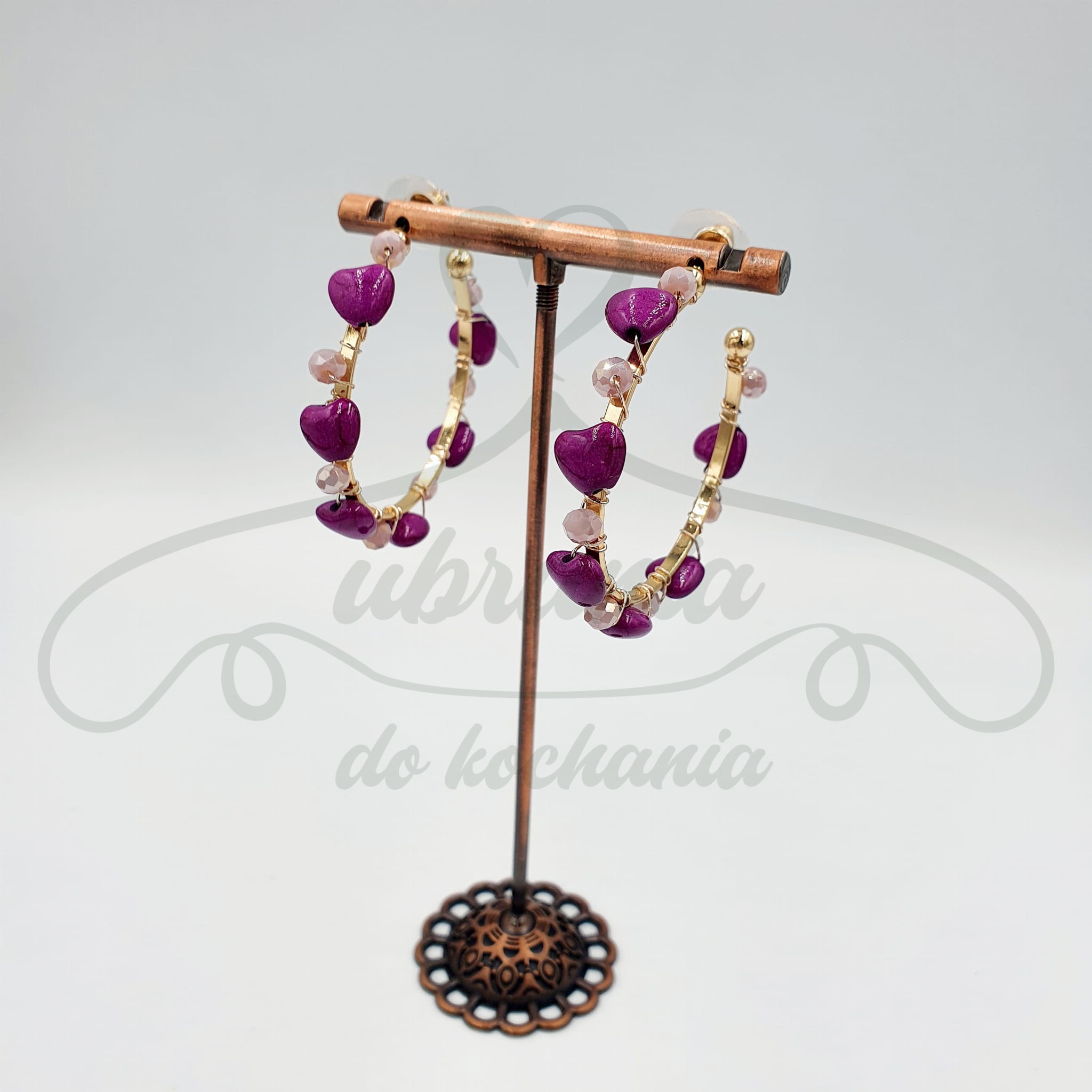 Kolczyki w kolorze złotym z małymi koralikami oraz z sercami w kolorze fioletowym. Biżuteria sztuczna.