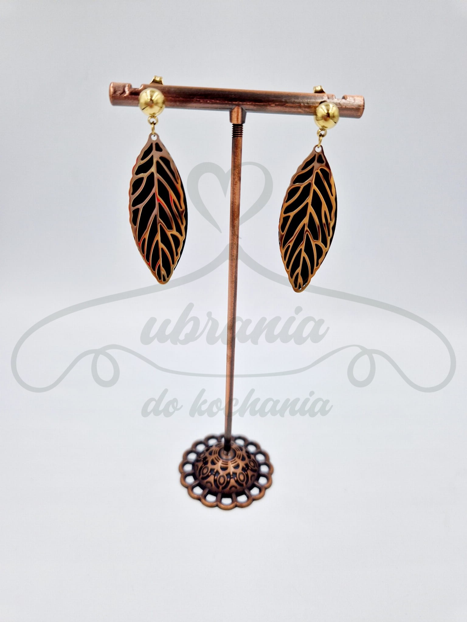Kolczyki w kolorze złotym duże listki. Wykonane ze stali szlachetnej. Czarna warstwa przykryta ażurowym, delikatnym liściem w kolorze złotym