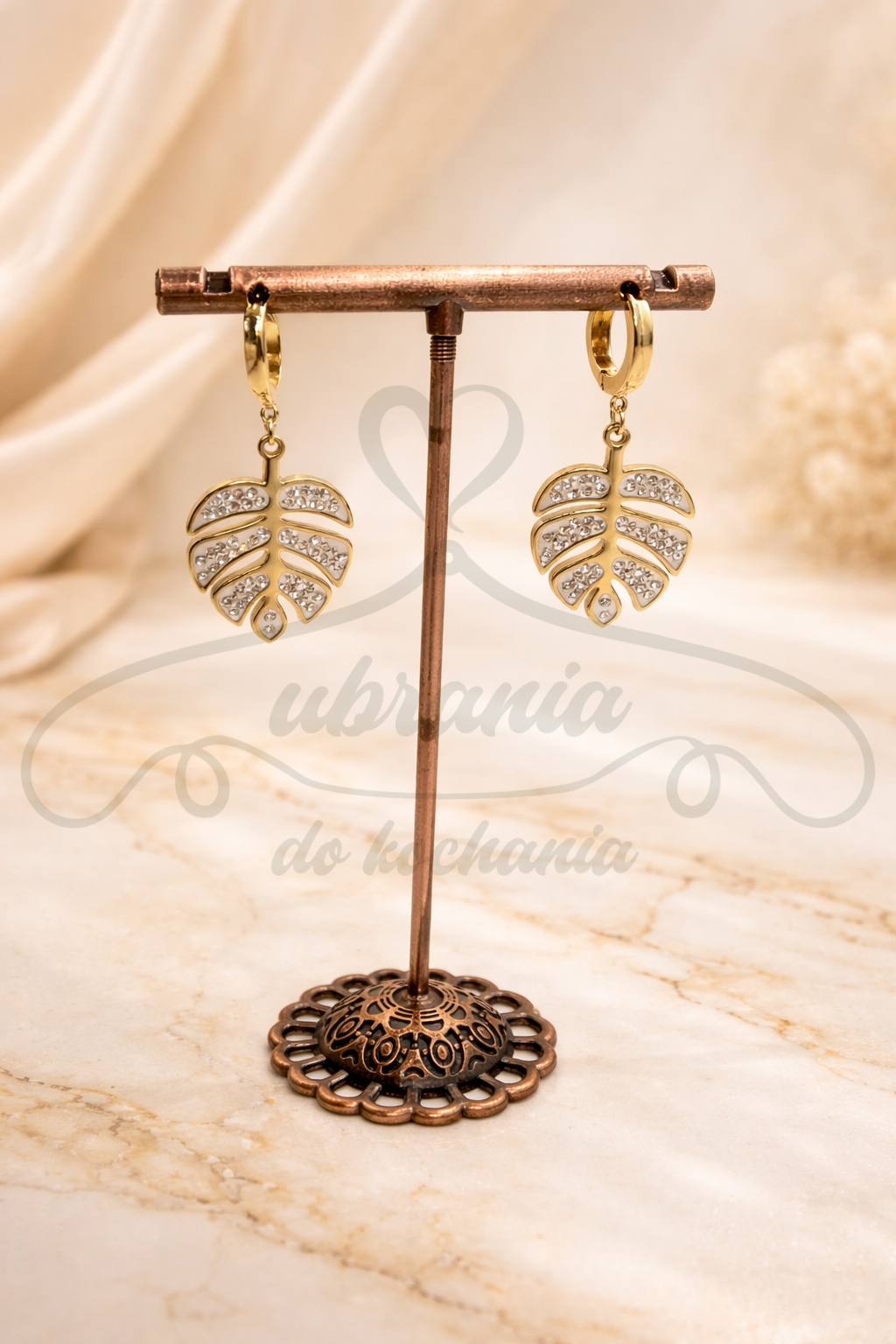 Kolczyki wykonane ze stali szlachetnej w złotym kolorze z zawieszką w kształcie liścia. Ozdobione delikatnymi cyrkoniami, które pięknie odbijają światło i dodają biżuterii elegancji.