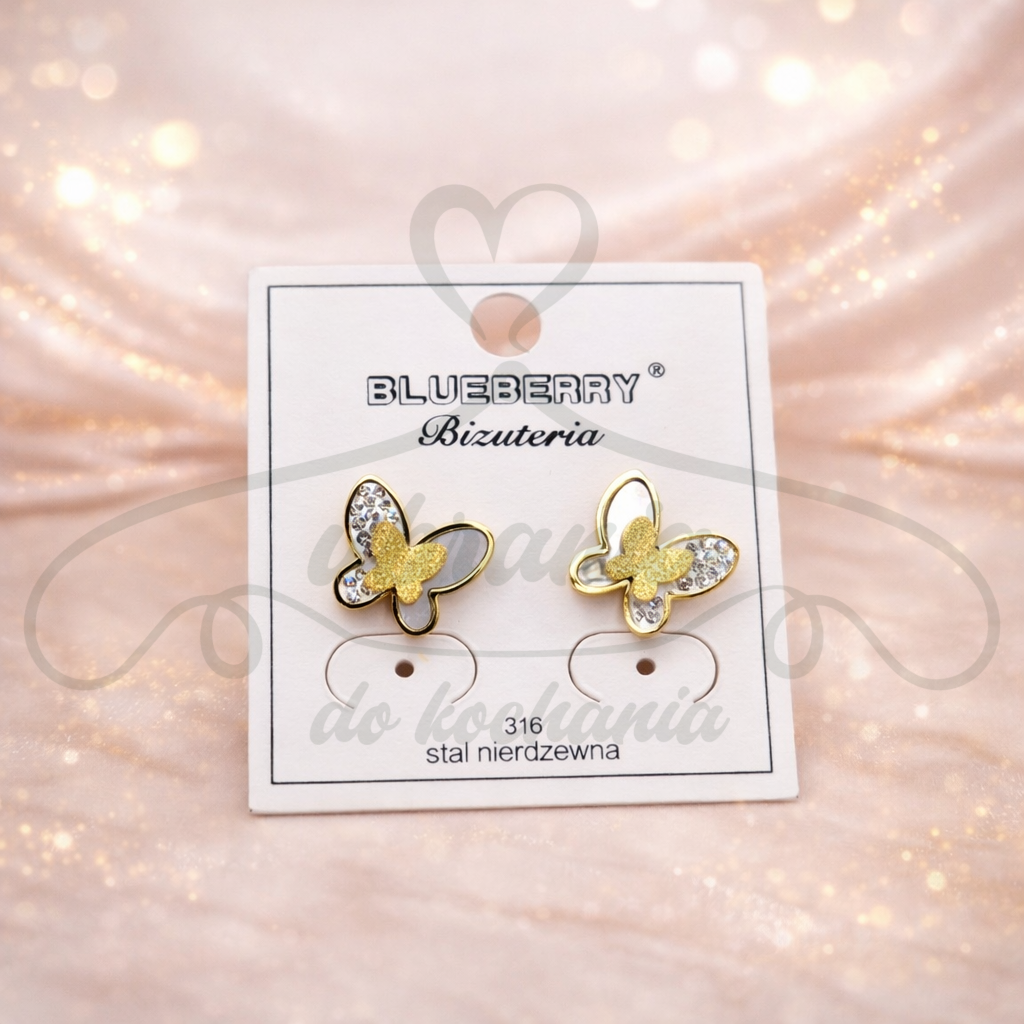 Złote kolczyki ze stali szlachetnej w kształcie motylków – jedne błyszczące, drugie matowe, tworzą razem delikatną, ale niezwykle efektowną kompozycję. Idealne na wiosnę, lato, randkę lub jako uroczy prezent.