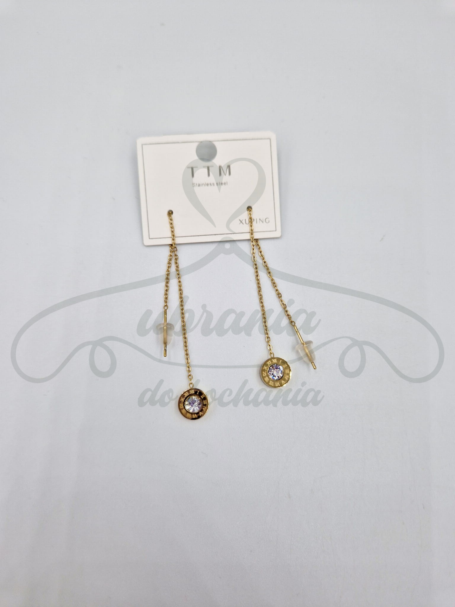 Kolczyki z złote, długie, przeciągane z małym kółeczkiem z cyrkonią oraz rzymskimi cyframi. Model wykonany ze stali szlachetnej 316L.