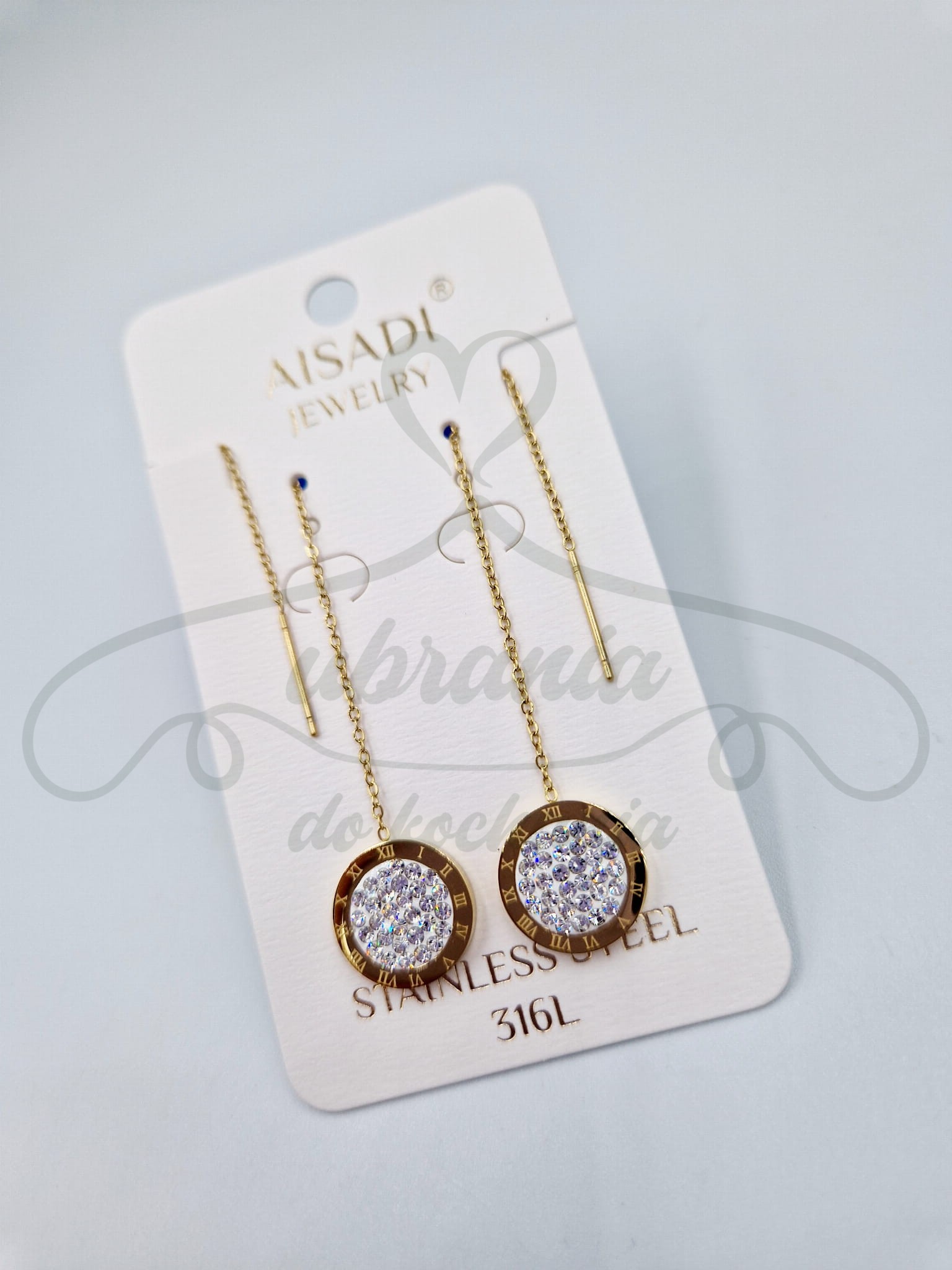 Kolczyki długie, przeciągane z kółkiem wypełnionym cyrkoniami z rzymskimi cyframi w kolorze złotym. Model wykonany ze stali szlachetnej 316L.