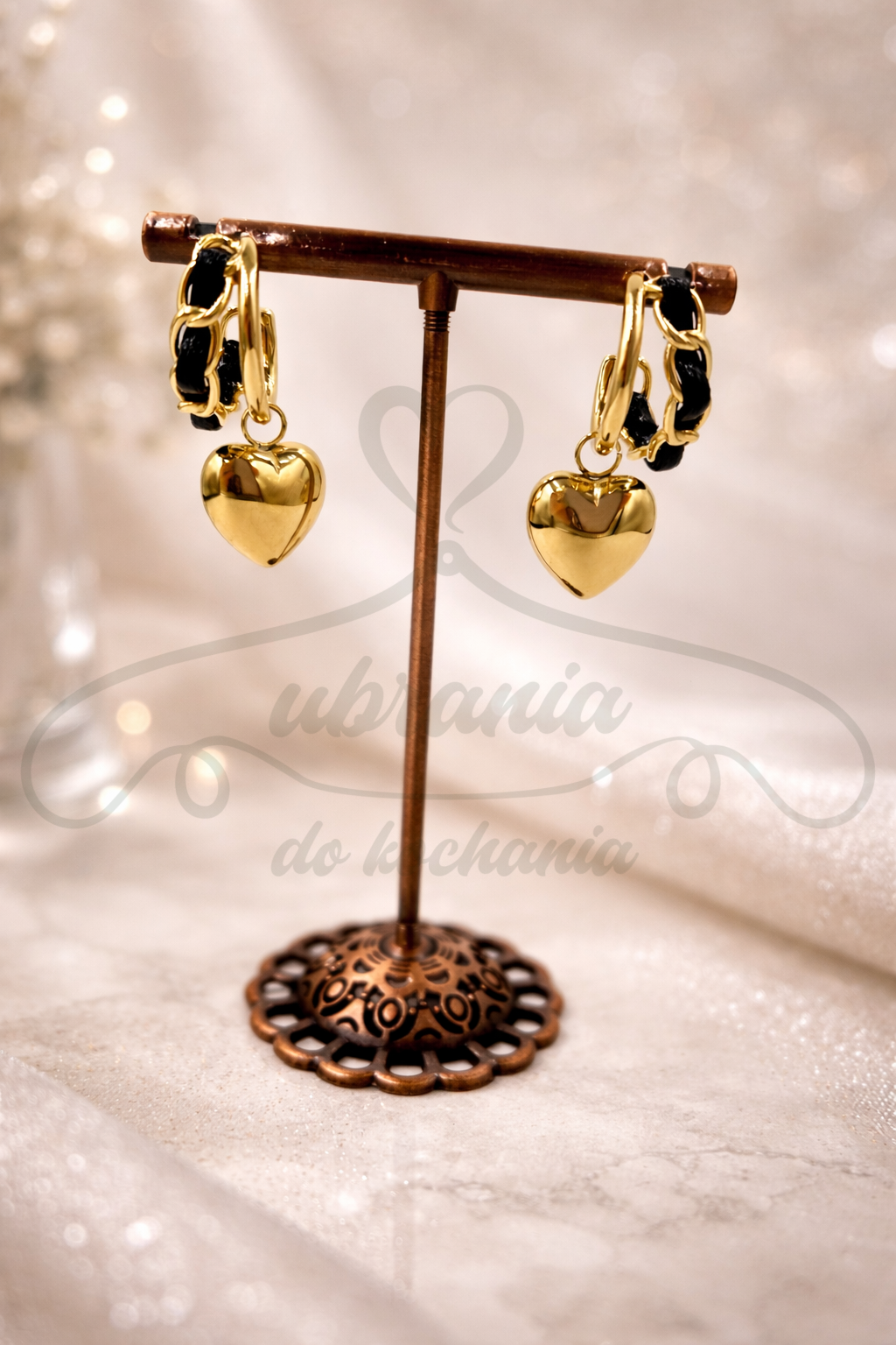 Kobiece kolczyki w kolorze złotym z grubymi serduszkami na otwartym kółku z czarna plecionką. Stworzone z najwyższą starannością. Są idealnym uzupełnieniem do każdej stylizacji oraz na wyjątkowe okazje. W całości wykonane z wysokiej jakości stali szlachetnej.