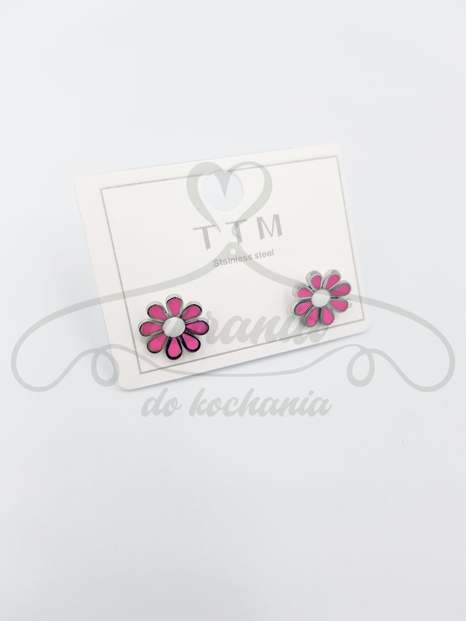 Kolczyki w kolorze srebrnym z różowymi kwiatkami, zapinane na wkrętkę. Model wykonany ze stali szlachetnej 316 L